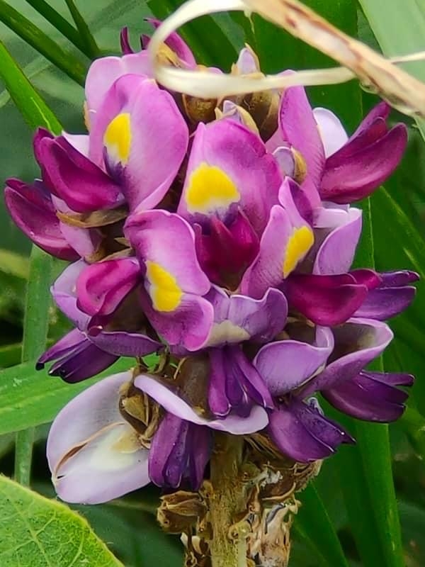 ![]() 上面照片:林美燕拍攝 (總狀花序,花序梗被毛;花冠蝶形,粉紅色至紫藍色,旗瓣中間黃色) |