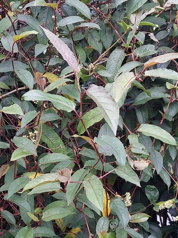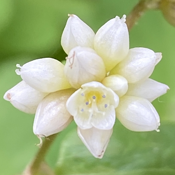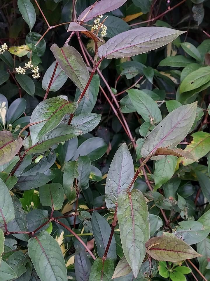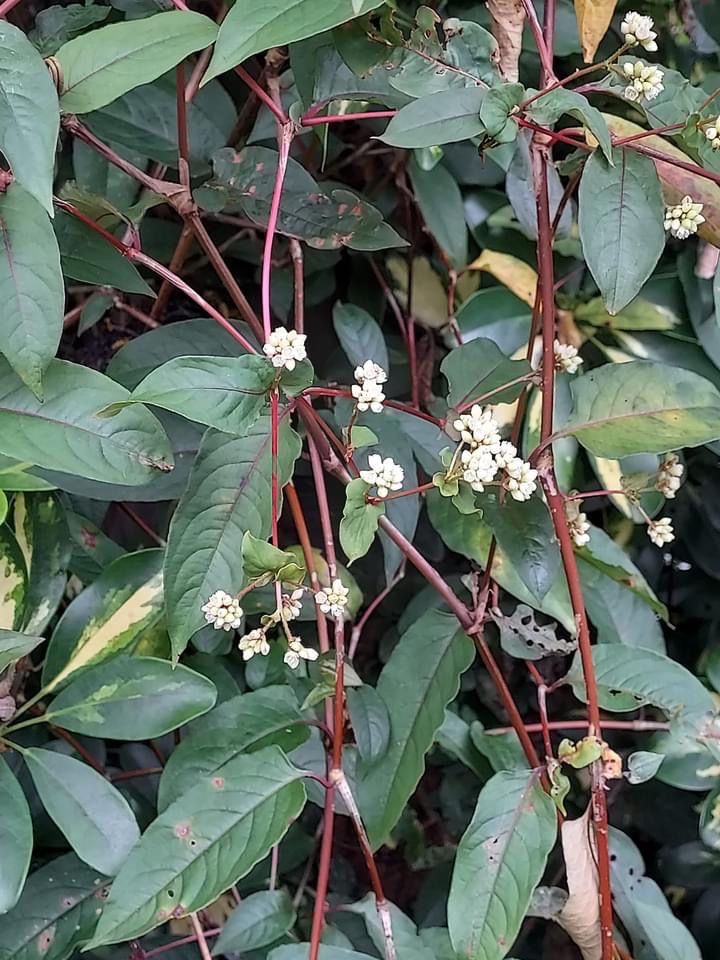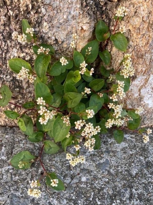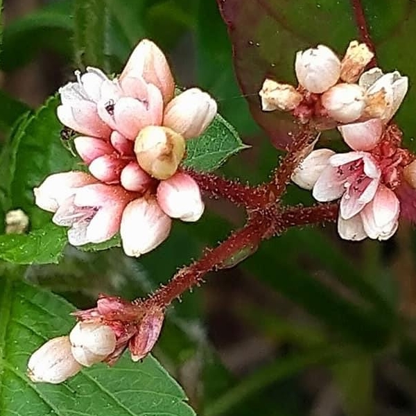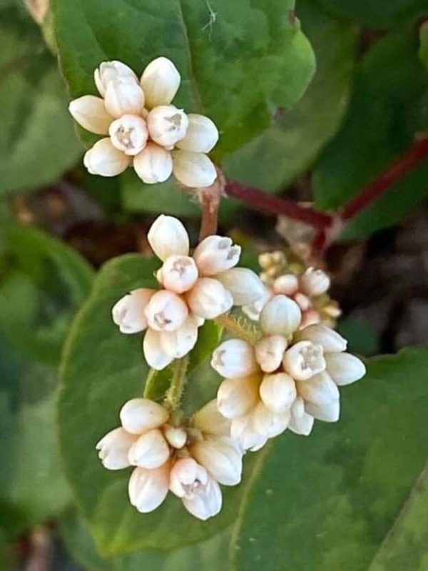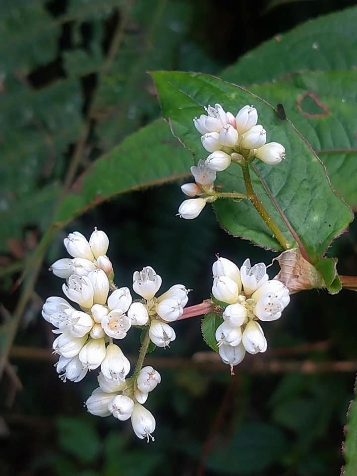 (原生種;原生於台灣、日本至印度和印尼一帶;俗稱秤飯藤;多年生草本;半攀緣性,莖直立或斜生蔓狀;莖節膨大多分枝,嫩莖紫紅色;單葉互生,長卵形,葉面常有V字形斑塊,中肋常呈紅色;葉鞘無緣毛,先端斜截狀;頭狀花序,呈繖房狀,頂生,花軸被腺毛;花被片5枚,白色;雄蕊8枚,雌蕊柱頭3叉;花被片於花後變透明狀,包覆果實;瘦果卵形,成熟黑色)