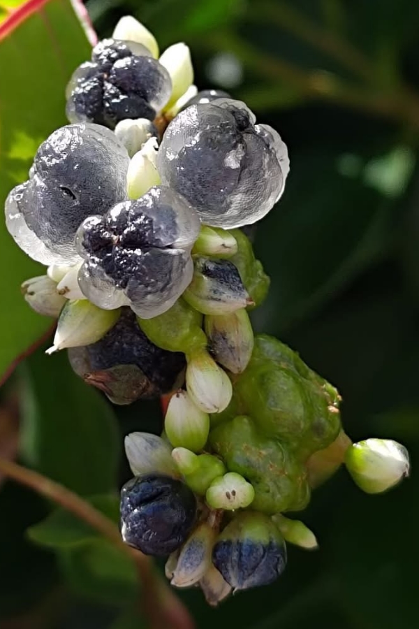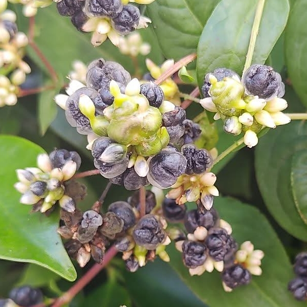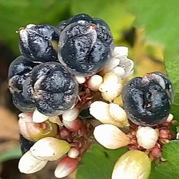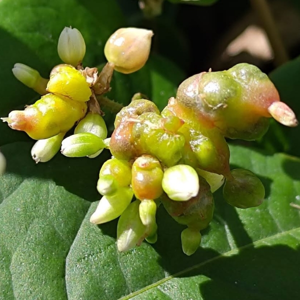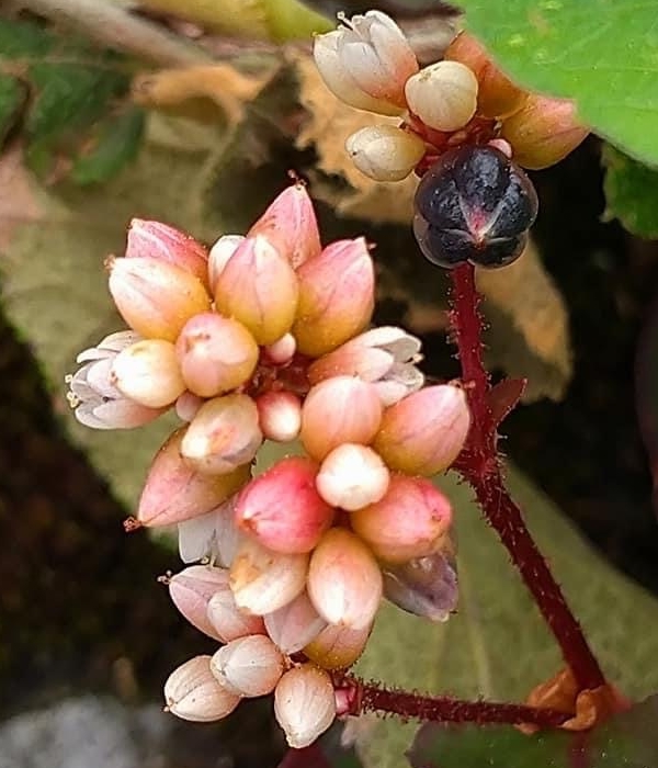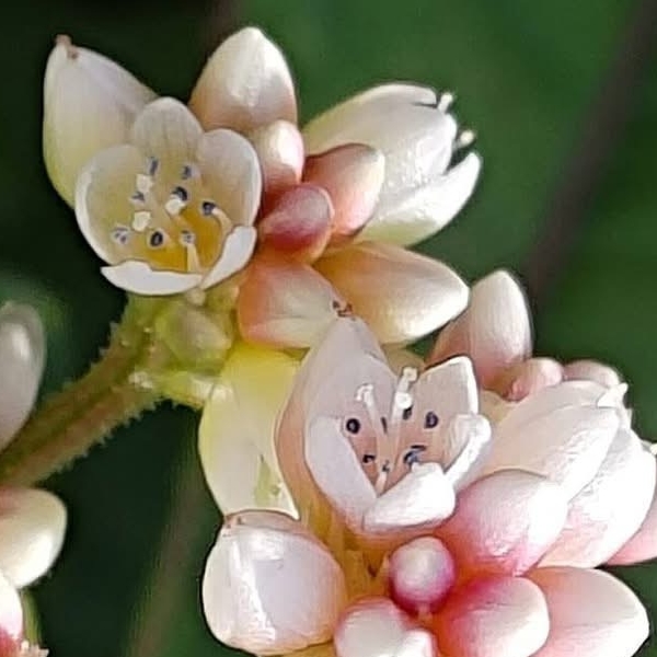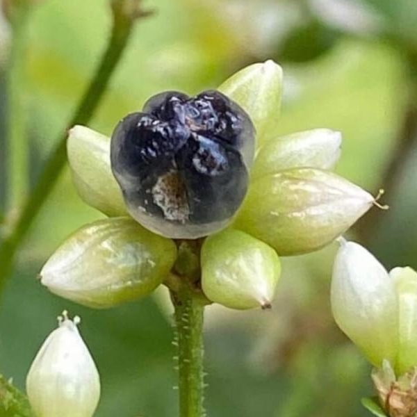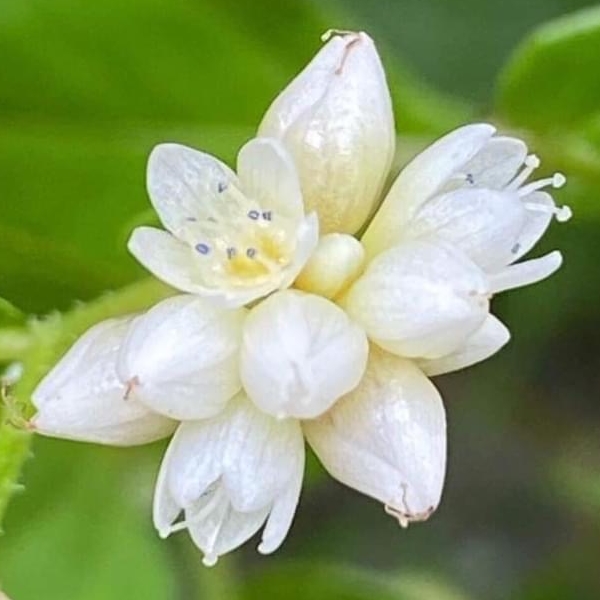![]() 上面照片:江亮亮拍攝 (頭狀花序,呈繖房狀,頂生,花軸被腺毛;花被片5枚,白色;雄蕊8枚,雌蕊柱頭3叉;花被片於花後變透明狀,包覆果實;瘦果卵形,成熟黑色) |