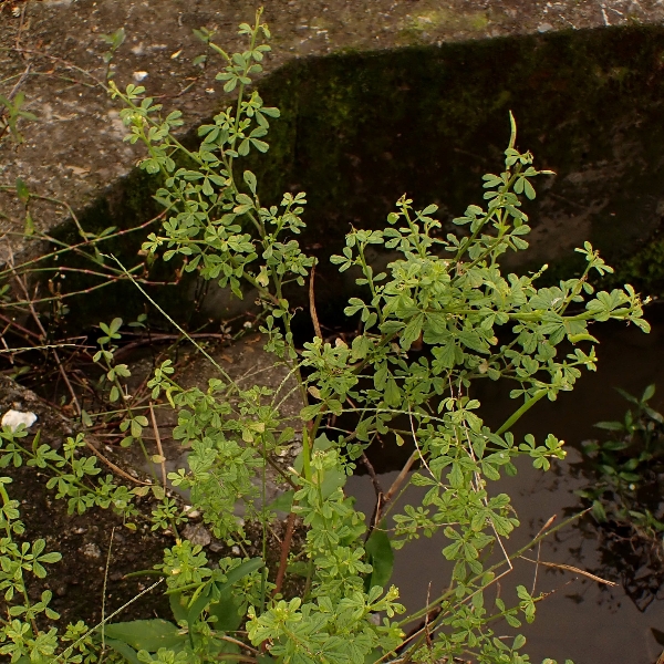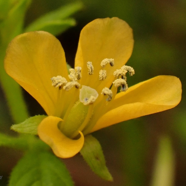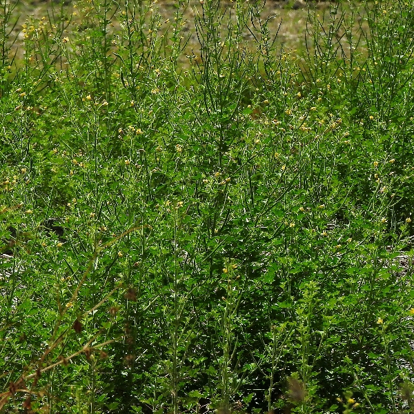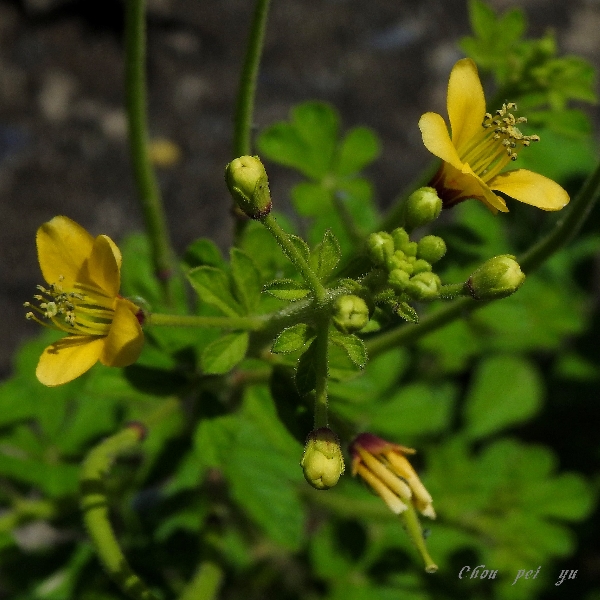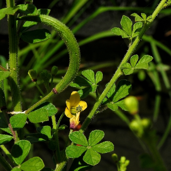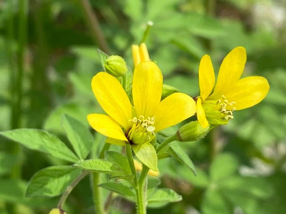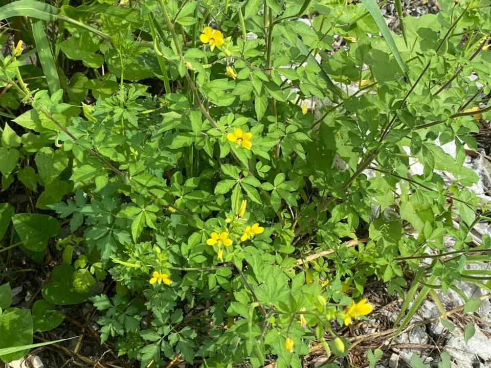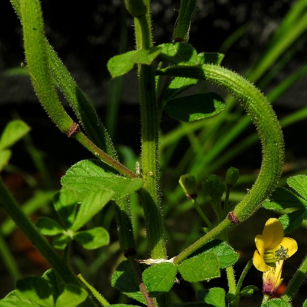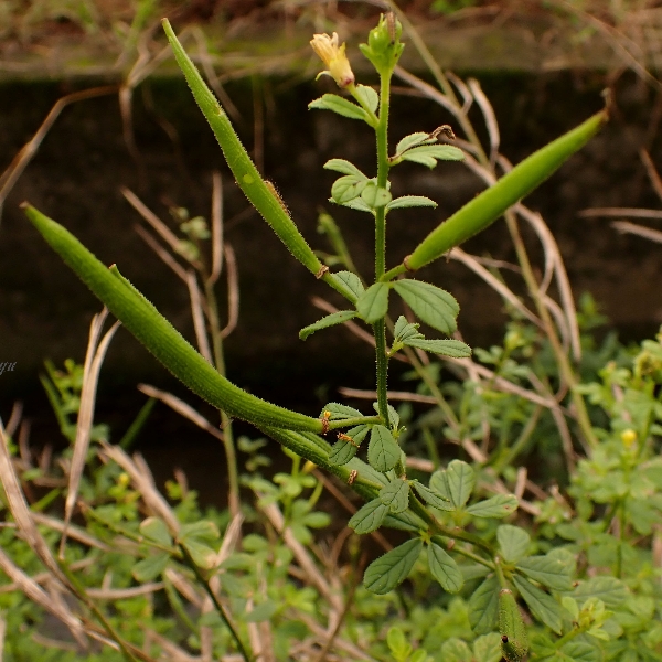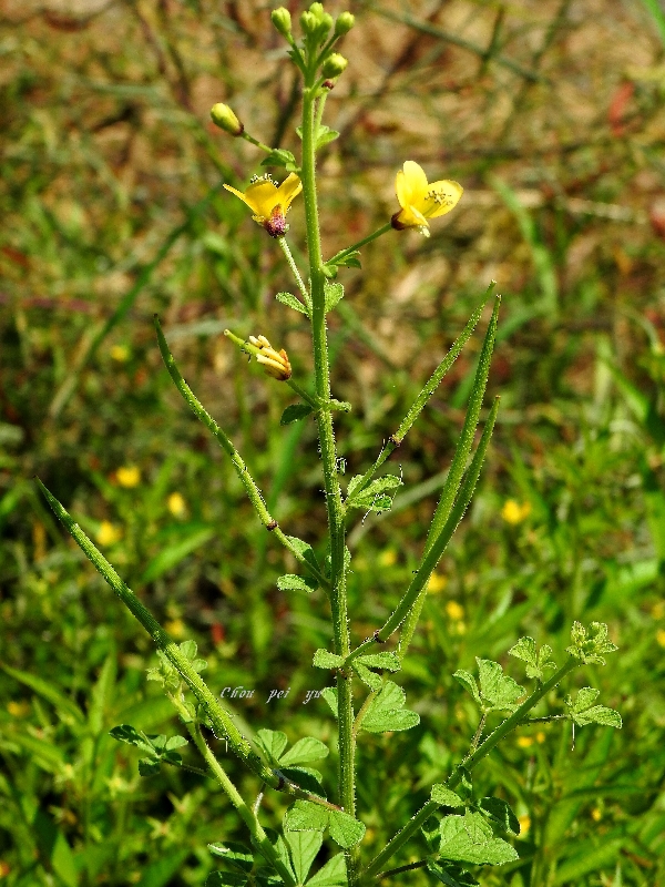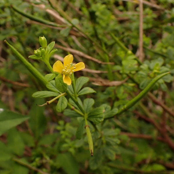 (原生種;世界植物在線標示原生地廣泛分布於亞洲、非洲及澳洲,包含台灣;台灣物種名錄標名向天黃,標示歸化種;維基百科標名黃花草;草本;莖有腺毛;掌狀複葉,互生;小葉3~5枚,倒卵形至倒長卵形,全緣;花朵單生葉腋或於頂端形成總狀花序;花瓣4枚,黃色;雄蕊10多枚;蒴果,線狀圓柱形,密被腺毛,成熟時自頂端向下開裂,種子多數,棕色,表面具有條紋)