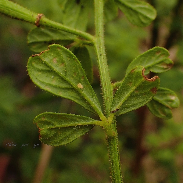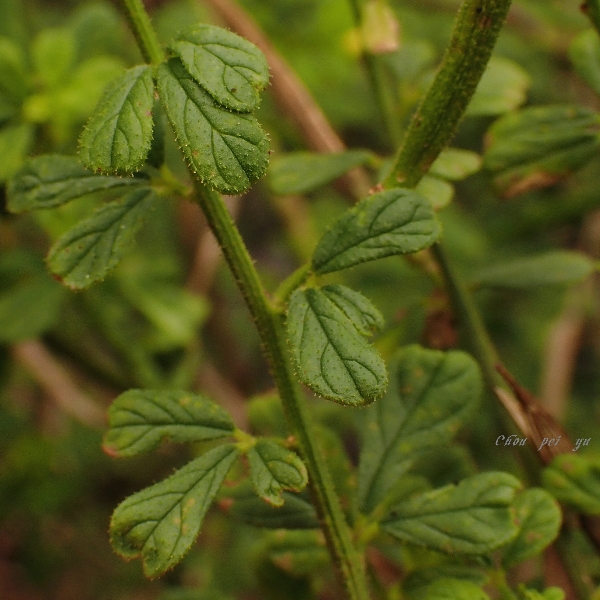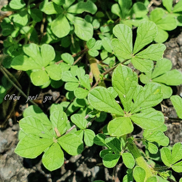 ![]() 上面照片:周佩玉拍攝 (莖有腺毛;掌狀複葉,互生;小葉3~5枚,倒卵形至倒長卵形,全緣) |