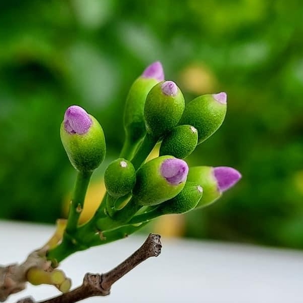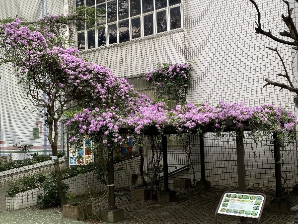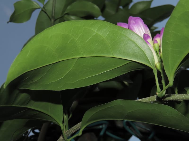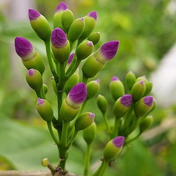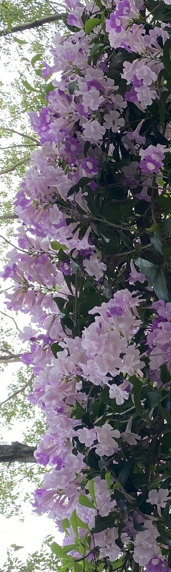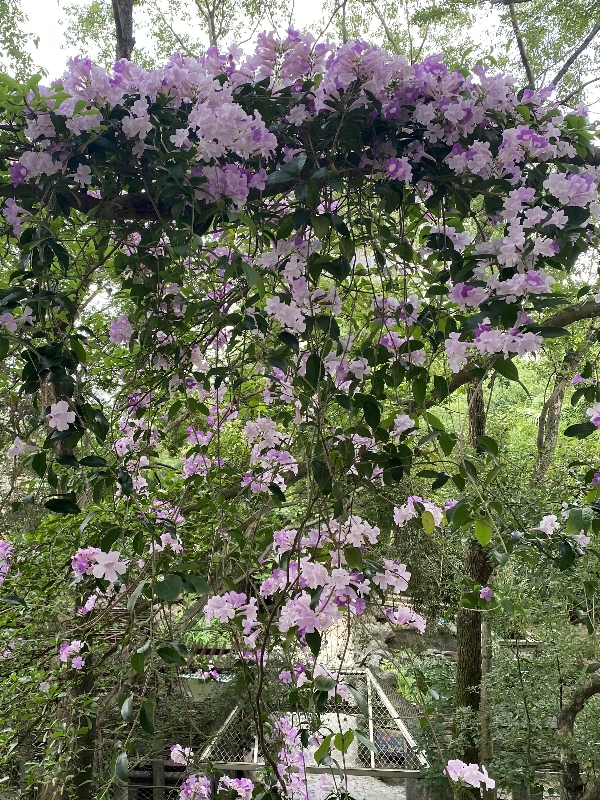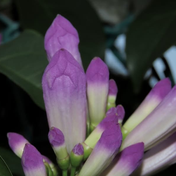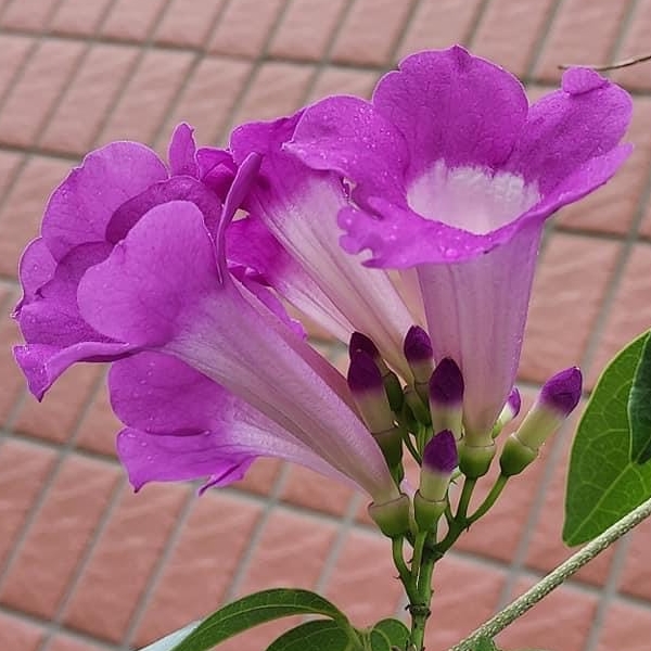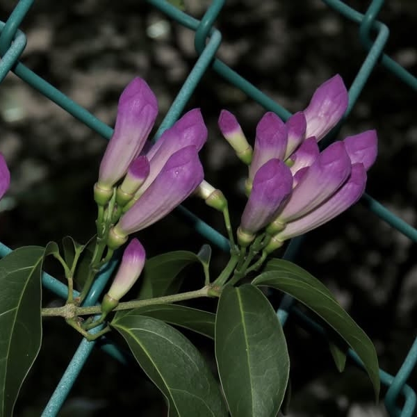 (栽培種;原生於南美洲;木質藤本;三出複葉,對生;小葉3枚,橢圓形至長橢圓形,全緣,頂小葉消失或特化為卷鬚,藉以攀爬生長;聚繖花序,腋生或頂生;花冠喇叭形,5瓣,紫紅色轉粉紫色,筒部粉紫色;蒴果長條狀,扁平;種子扁平,具膜翅,可藉風力傳播繁衍;葉片搓揉後具有大蒜味,故名蒜香藤)