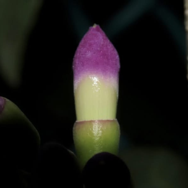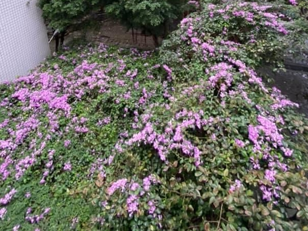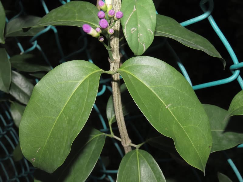 ![]() 上面照片:陳維琪拍攝 (聚繖花序,腋生或頂生;花冠喇叭形,5瓣,紫紅色,筒部白色) |