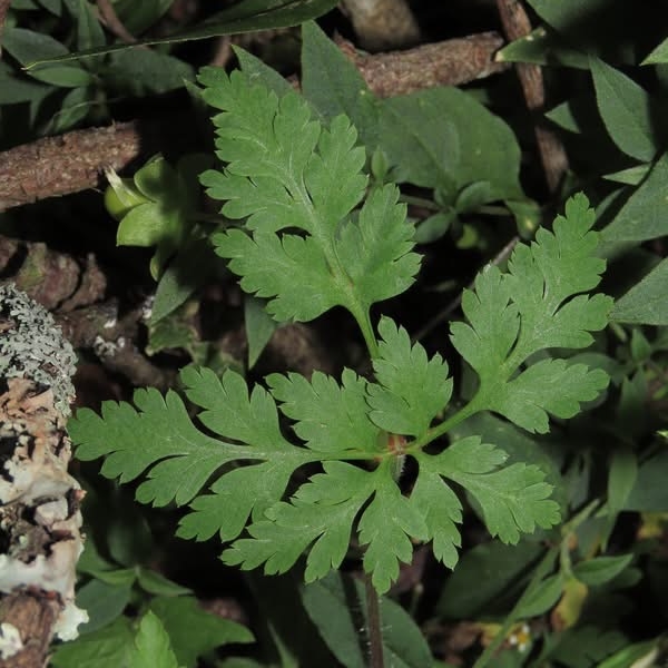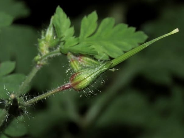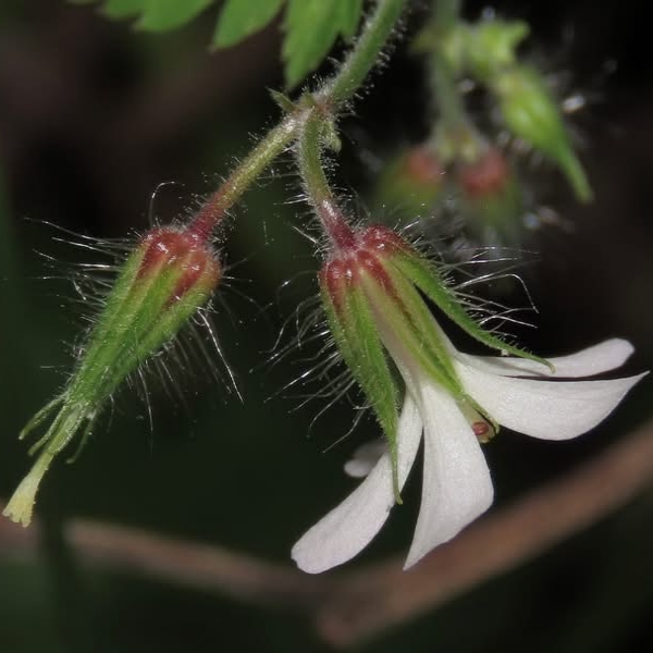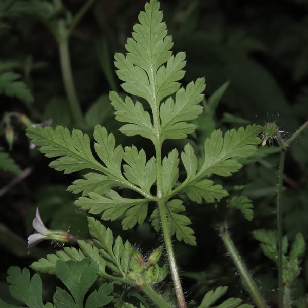 (原生種;原生於亞洲、歐洲、非洲和美洲;台灣物種名錄標名漢紅魚腥草,附有照片;維基百科標名漢葒魚腥草;草本;莖直立,纖細,被疏柔毛及腺毛;2~3回羽狀複葉,對生;葉緣羽裂狀,葉柄細長;花序腋生,1梗2花,總梗細長;花瓣5枚,倒長卵形,白色、粉紅色至紫紅色,花梗細長;雄蕊5枚,雌蕊柱頭頂端短5叉;花萼5枚,披針形;蒴果具長喙狀突起)