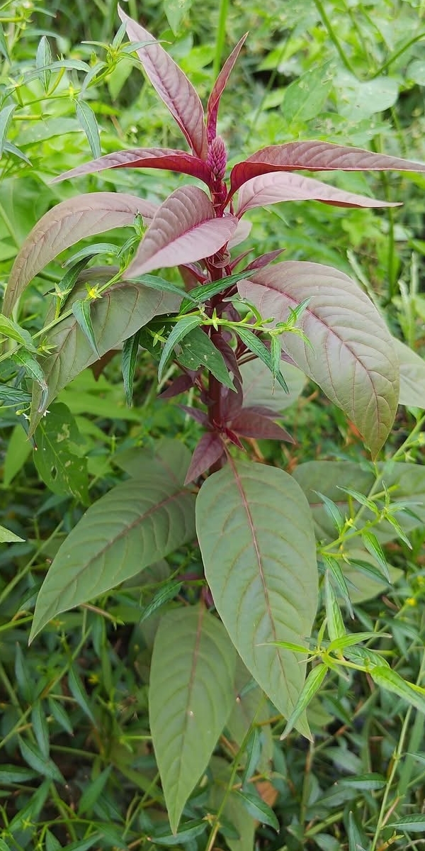 (歸化種;原生於非洲熱帶區域;直立草本;單葉互生,披針形;穗狀花序,腋生或頂生,小花密集;花被片5枚,白色至紫紅色;雄蕊5枚,花絲基部合生,雌蕊柱頭頂端2叉;胞果卵形,內含黑色扁圓形種子3~4顆,具光澤)