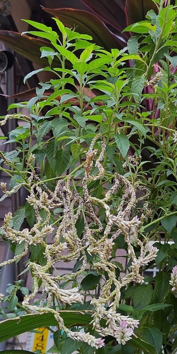![]() 上面照片:林美燕拍攝 (穗狀花序,腋生或頂生,小花密集;花被片5枚,白色至紫紅色;雄蕊5枚,花絲基部合生,雌蕊柱頭頂端2叉) |