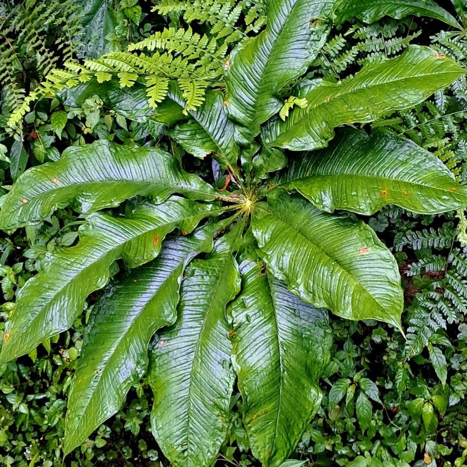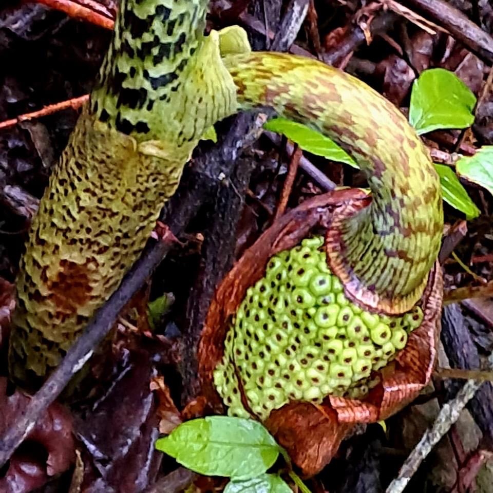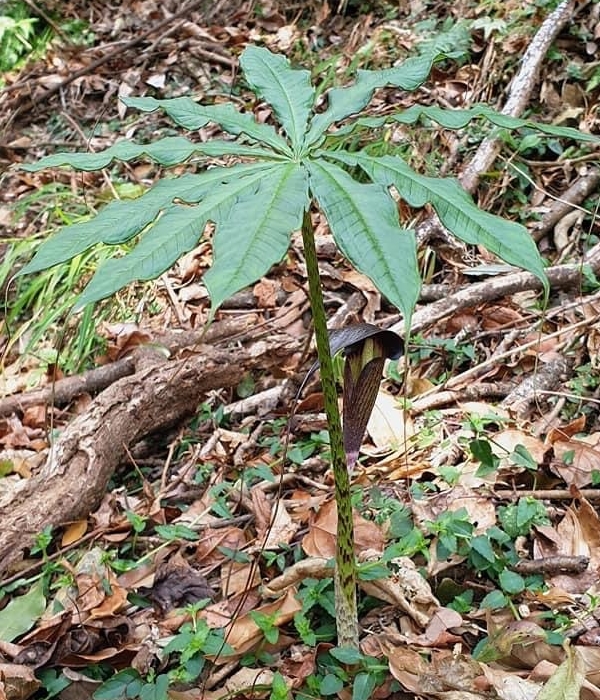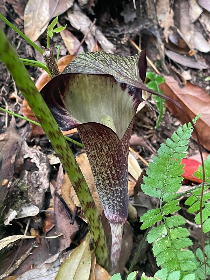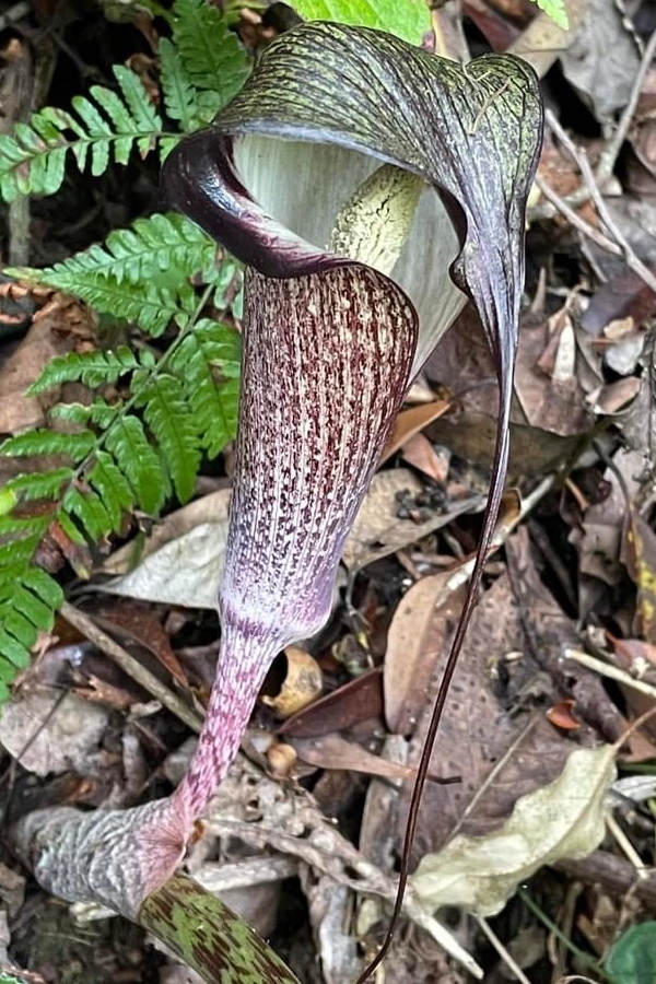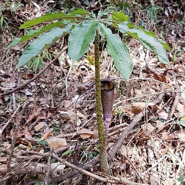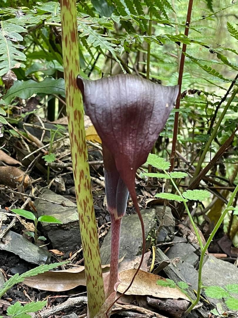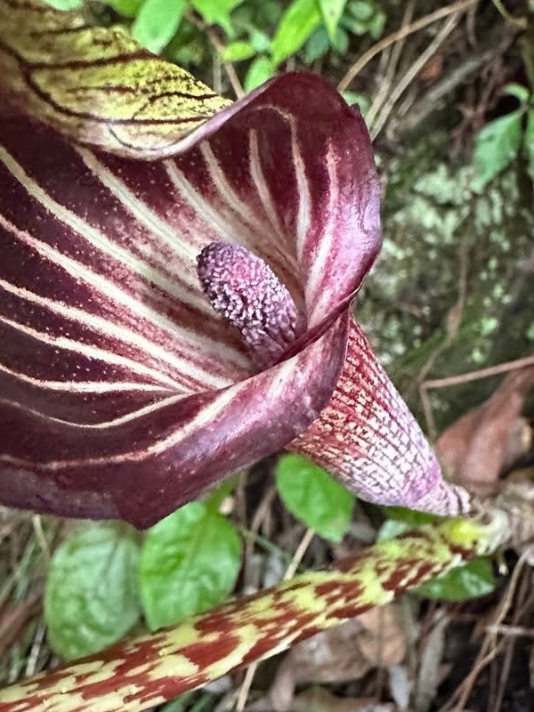 ![]() 上面照片:張儷蓁拍攝於新竹縣尖石鄉鎮西堡神木步道 (花序軸先端附屬物呈現不規則皺褶狀;佛焰苞常呈暗紫色,先端具絲狀長尾) |