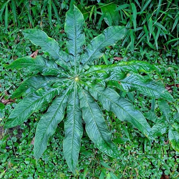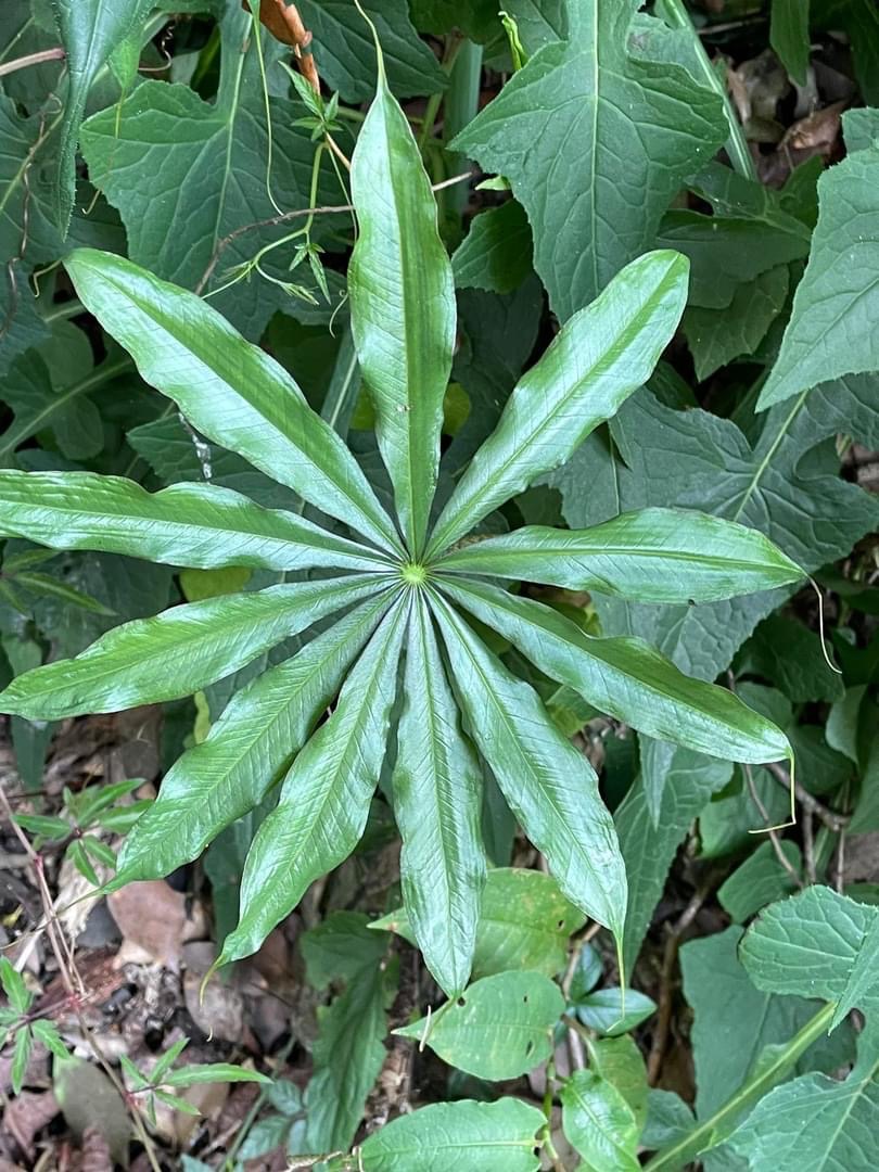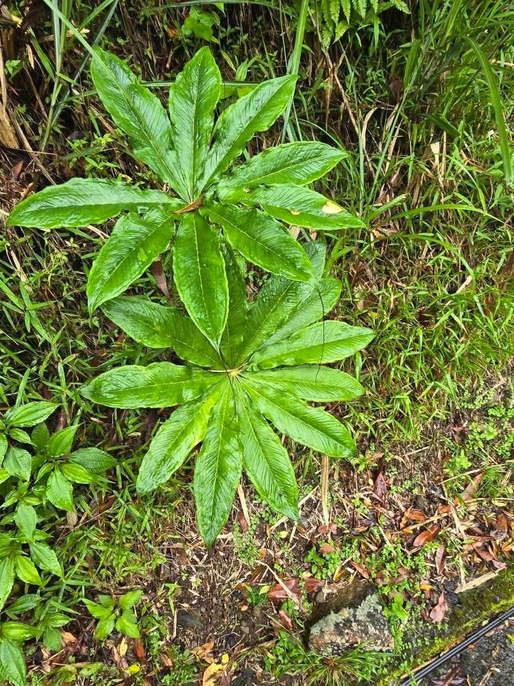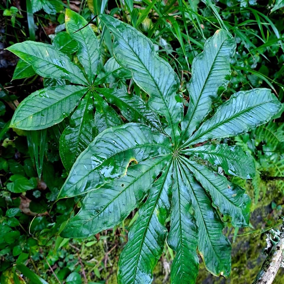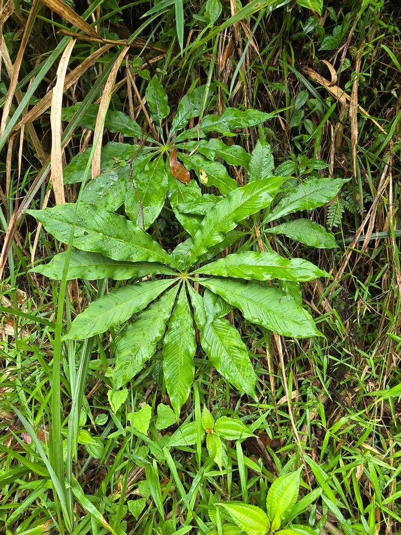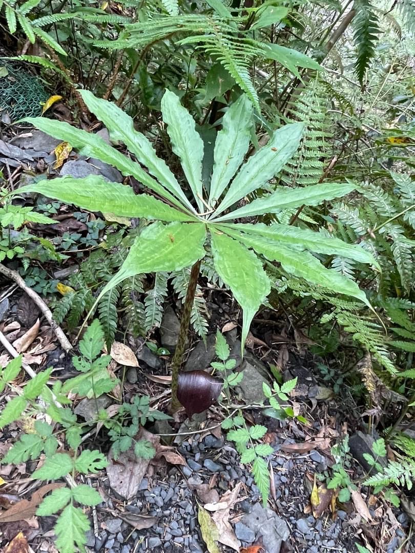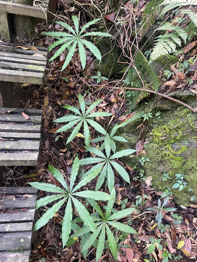 ![]() 上面照片:鄭演義拍攝 (掌狀複葉,單生;小葉約10枚或更多,倒披針形,葉面皺褶狀,先端具絲狀長尾) |
