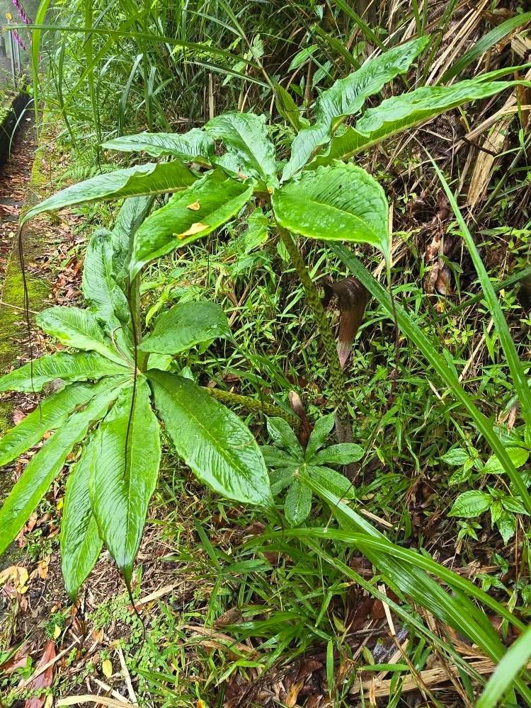 (台灣特有種;世界植物在線 POWO 標示 Arisaema taiwanense 和 Arisaema taiwanense var. taiwanense 和 Arisaema taiwanense var. brevipedunculatum 皆為台灣特有種;台灣物種名錄將 Arisaema taiwanense 標示原生種,將 Arisaema taiwanense var. taiwanense 標示台灣特有種;多年生草本;掌狀複葉,單生;小葉約10枚或更多,倒披針形,葉面皺褶狀,先端具絲狀長尾;雌雄異株,花單性;花序軸先端附屬物呈現不規則皺褶狀;佛焰苞常呈暗紫色,先端具絲狀長尾;果穗玉米狀)