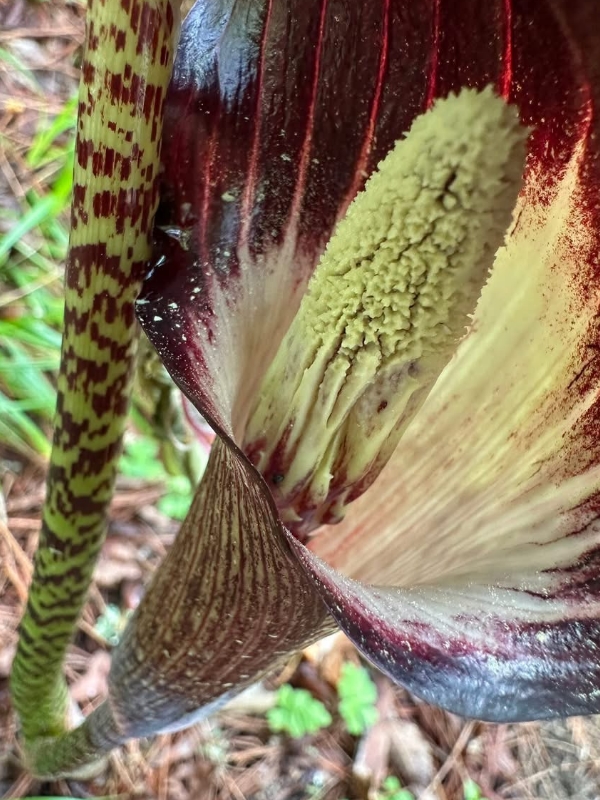 ![]() 上面照片:沈揮勝拍攝 (花序軸先端附屬物呈現不規則皺褶狀;佛焰苞常呈暗紫色,先端具絲狀長尾) |
