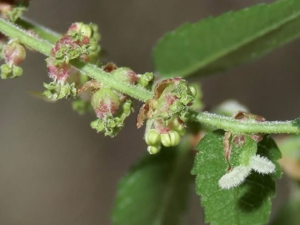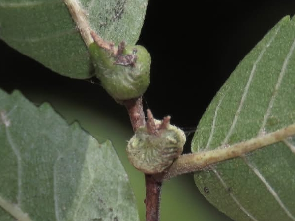 ![]() 上面照片:陳維琪拍攝 (單葉互生,卵形至卵狀披針形,鋸齒緣,羽狀脈,葉基略微歪斜,兩列互生於枝條上) |