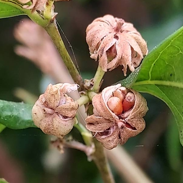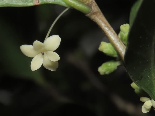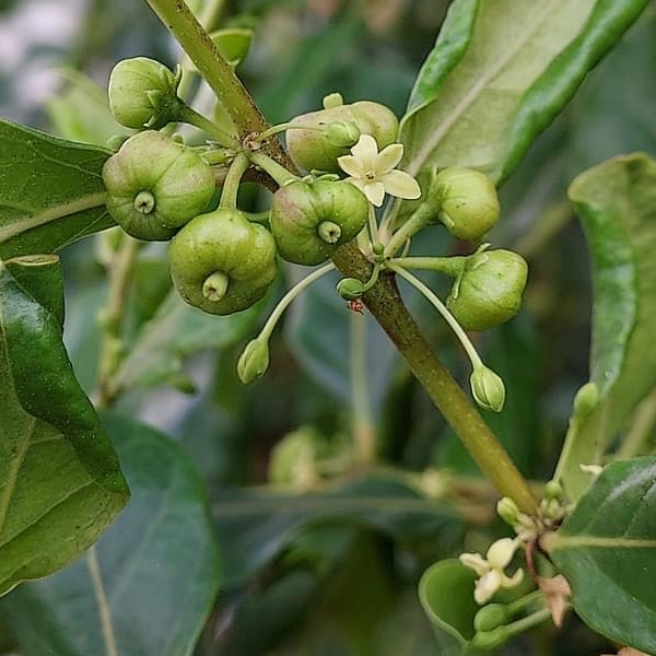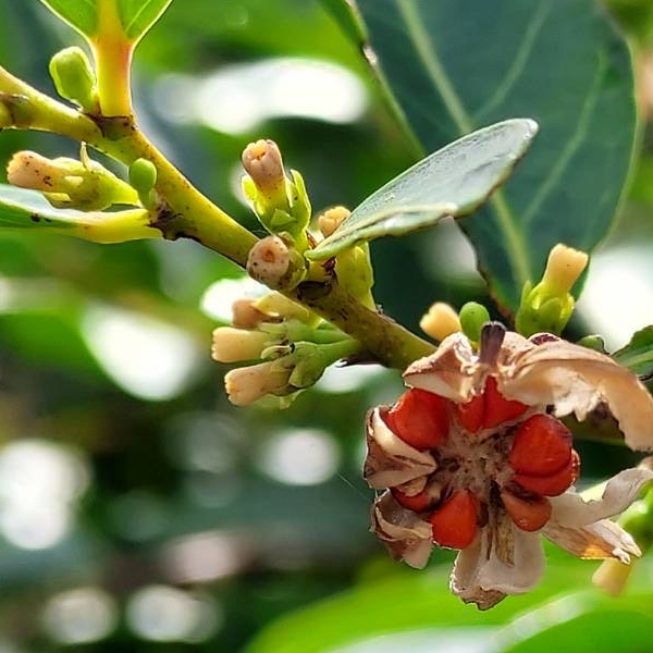 (原生種;小喬木或灌木;單葉互生,橢圓形(或長橢圓形),全緣;花序不具總梗,簇生葉腋,雌雄異花,不具花瓣;雄花花梗細長,花被片6枚,2輪,平展,橢圓形,白色;雌花花梗短小,花萼包覆,柱頭成筒狀,外伸;蒴果扁球形,瓣狀,光滑無毛,柱頭宿存;成熟瓣裂,種子紅色)
