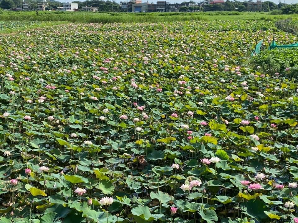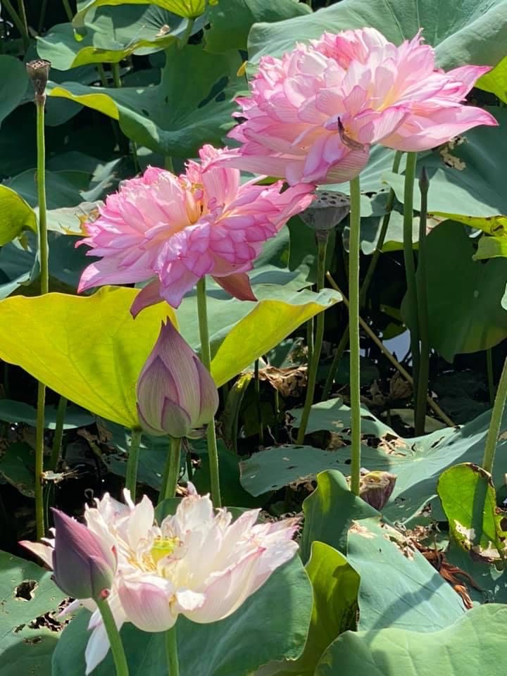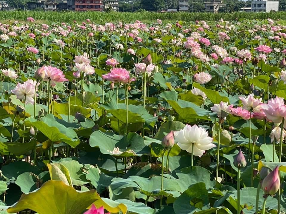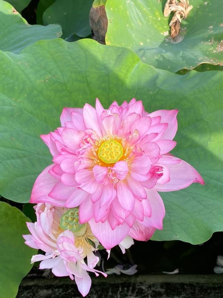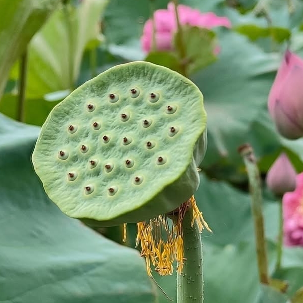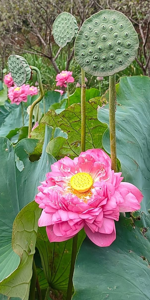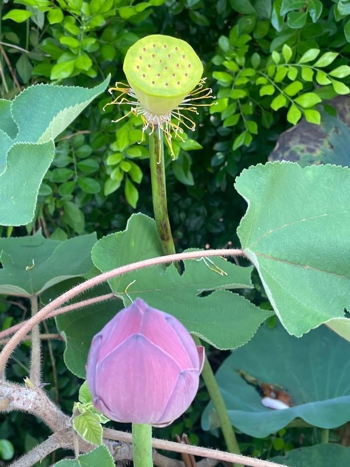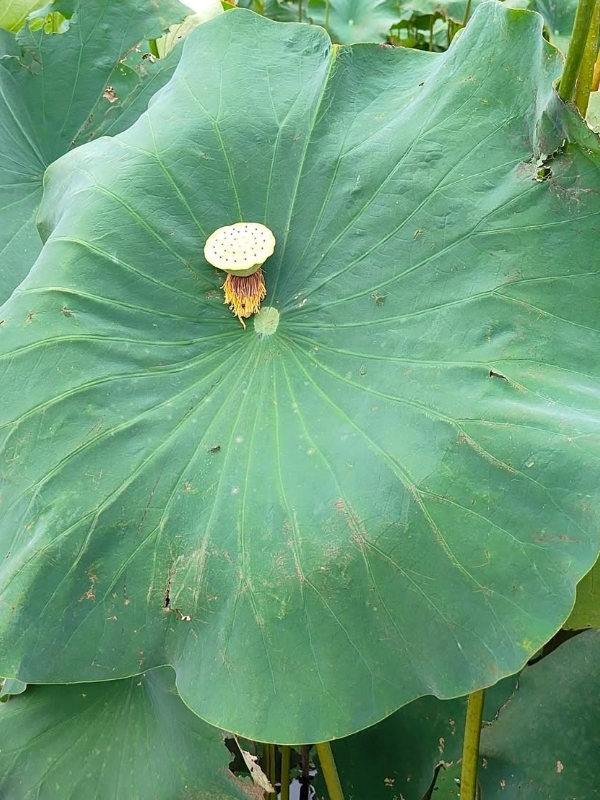 (發現花苞突破葉面,開花後的蓮蓬在葉面上)