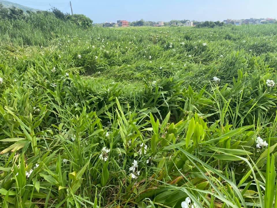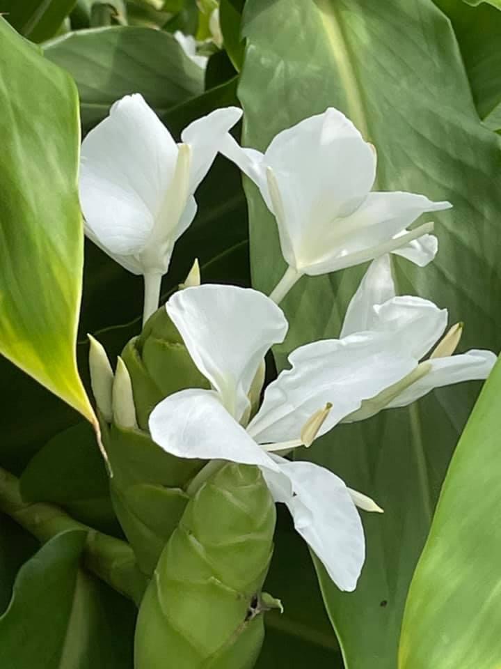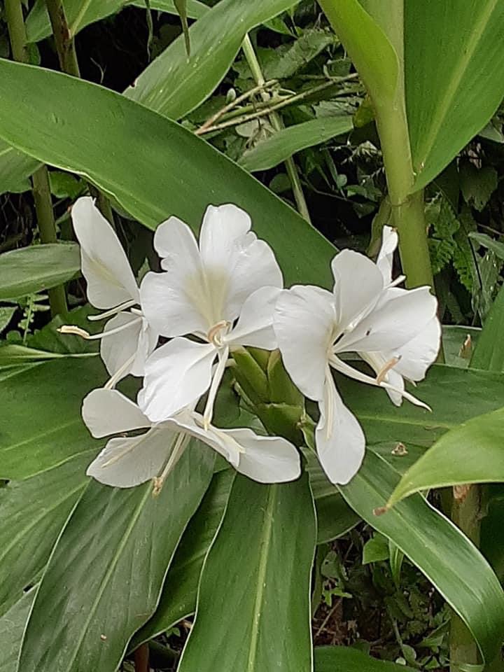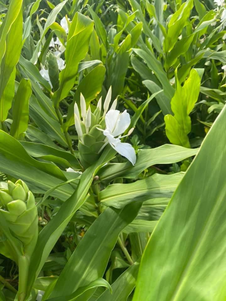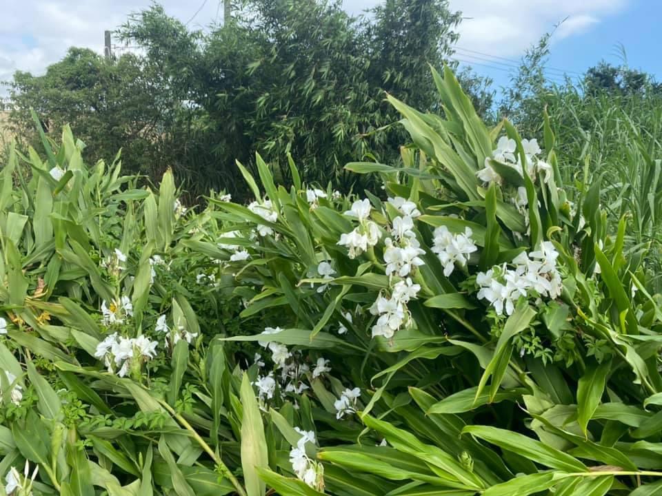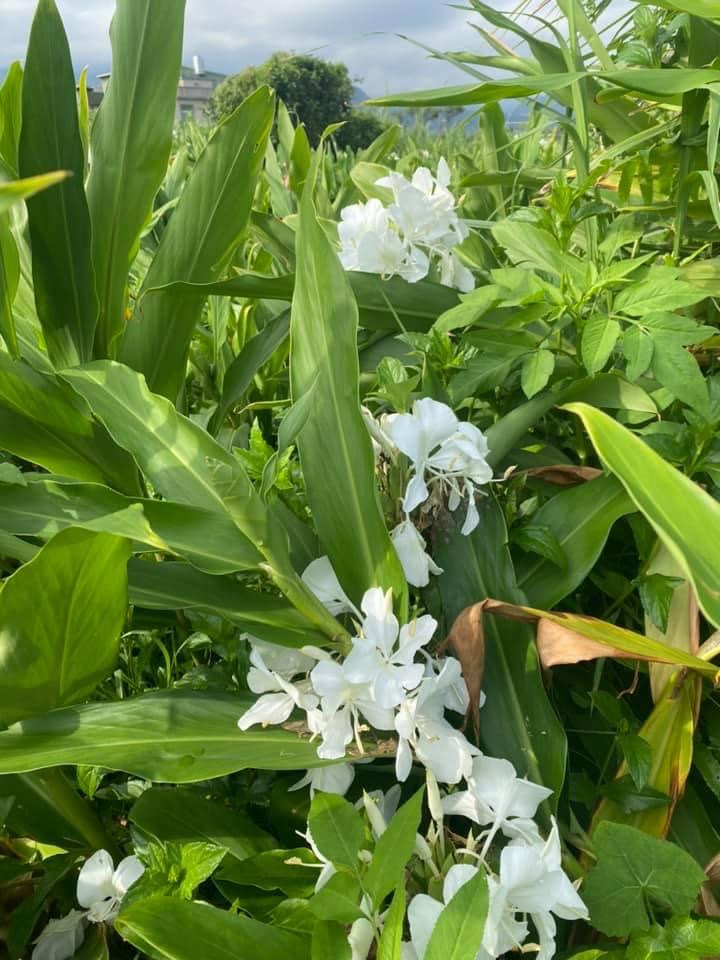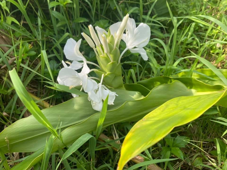 (歸化種;台灣物種名錄標名野薑花,附有照片;多年生草本;穗狀花序,花冠白色,中心黃色;花瓣3枚,線形;看似花瓣的構造,其實是瓣化的雄蕊,真正有生殖能力的雄蕊與花柱合生,花型如白色蝴蝶,花香濃郁;蒴果成熟3瓣裂,內含種子數顆,紅色)