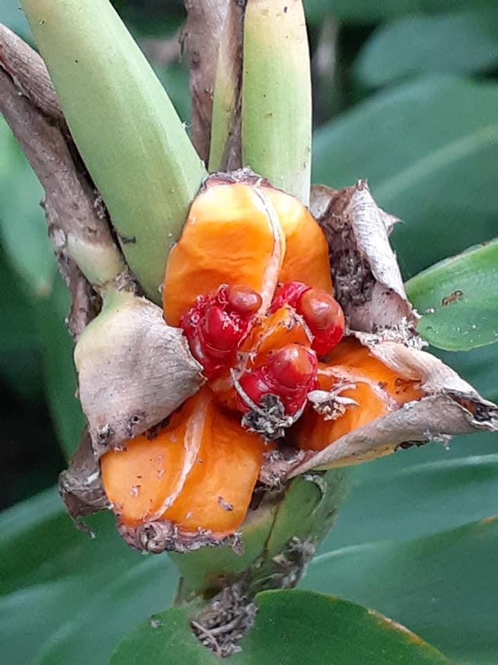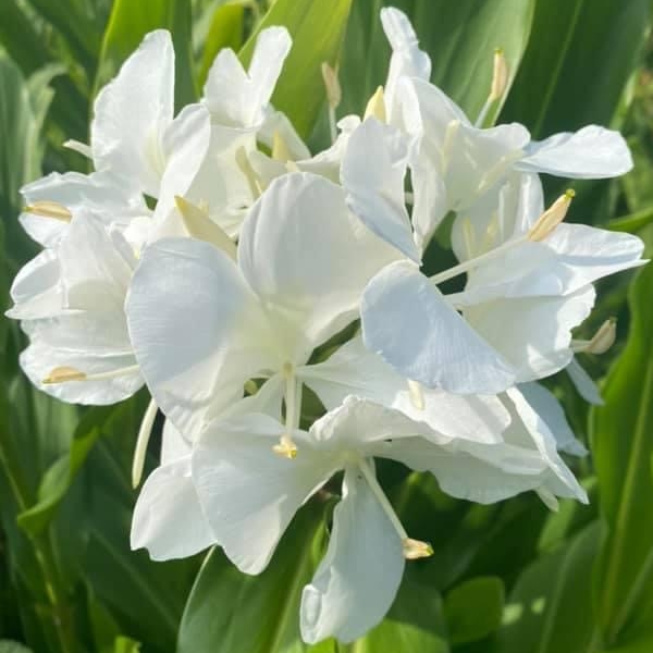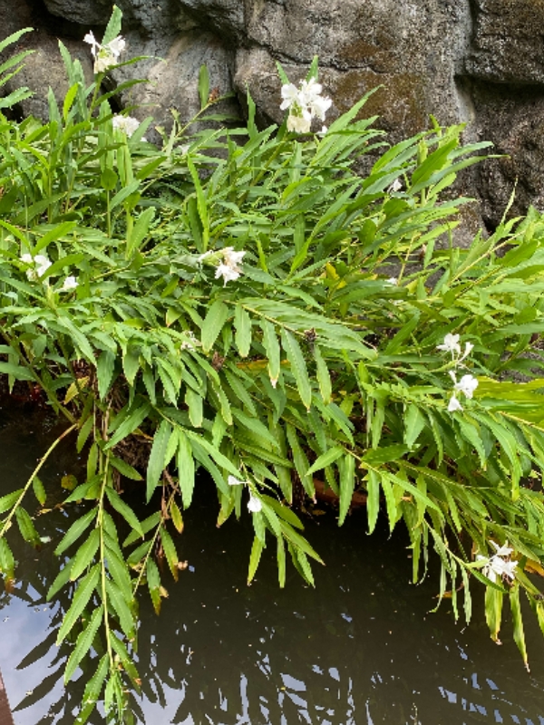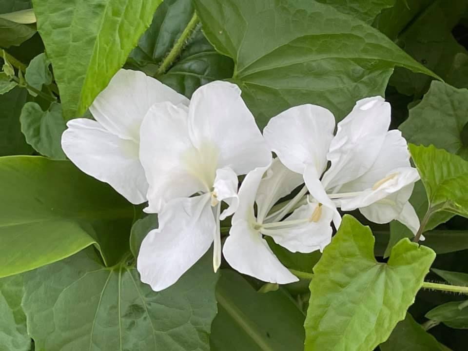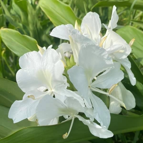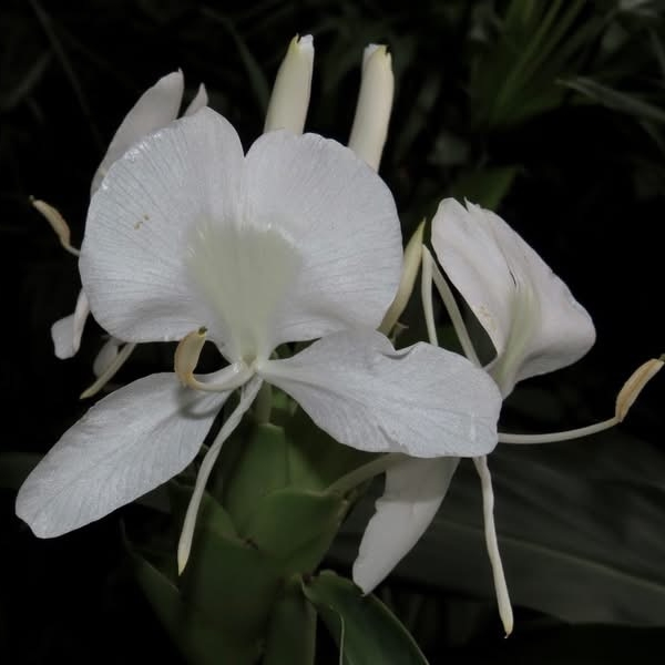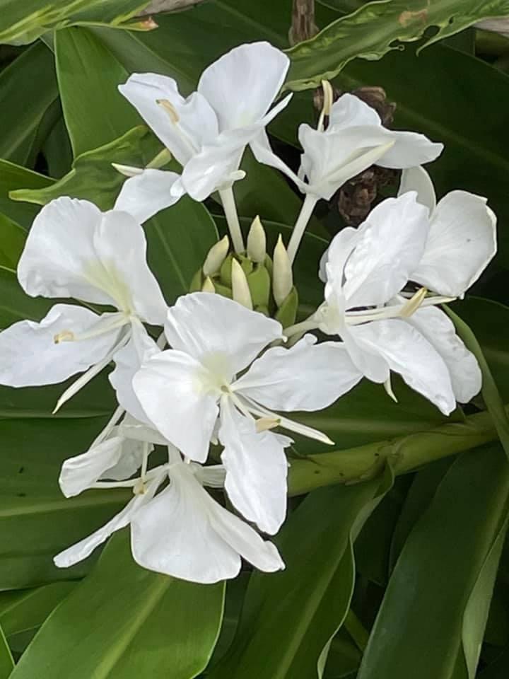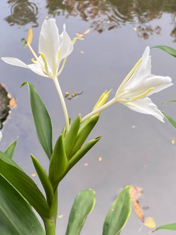 (歸化種;台灣物種名錄標名野薑花,附有照片;多年生草本;穗狀花序,花冠白色,中心黃色;花瓣3枚,線形;看似花瓣的構造,其實是瓣化的雄蕊,真正有生殖能力的雄蕊與花柱合生,花型如白色蝴蝶,花香濃郁;蒴果成熟3瓣裂,內含種子數顆,紅色)