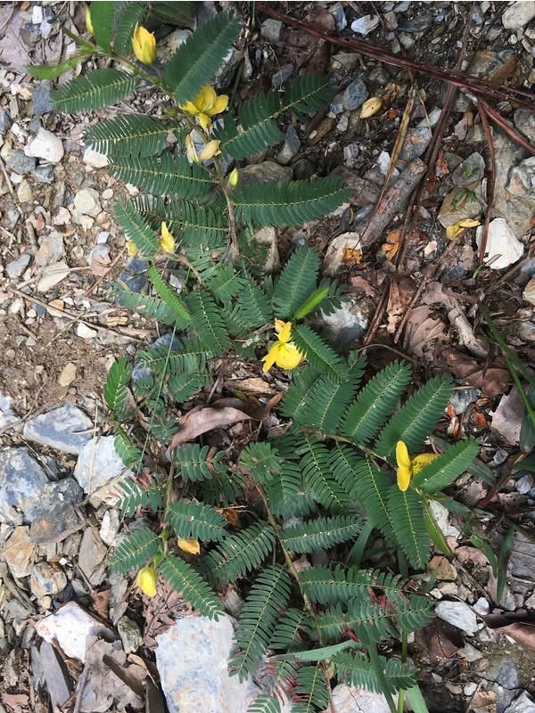 (原生種;世界植物在線 POWO 標示原產於台灣至南亞一帶,附有照片(相符);台灣物種名錄將 Chamaecrista leschenaultiana 標名大葉假含羞草;維基百科將 Chamaecrista leschenaultiana 標名大葉山扁豆;中國植物智將 Chamaecrista leschenaultiana 標名大葉山扁豆,別名短葉決明;一年生或多年生半灌木狀草本;直立或斜倚而生;一回羽狀複葉,小葉25對以下,線狀鐮刀形;單花或數朵腋生;花冠黃色,雄蕊10枚;莢果線狀鐮刀形,扁平,長3~5公分,有8~16枚種子)