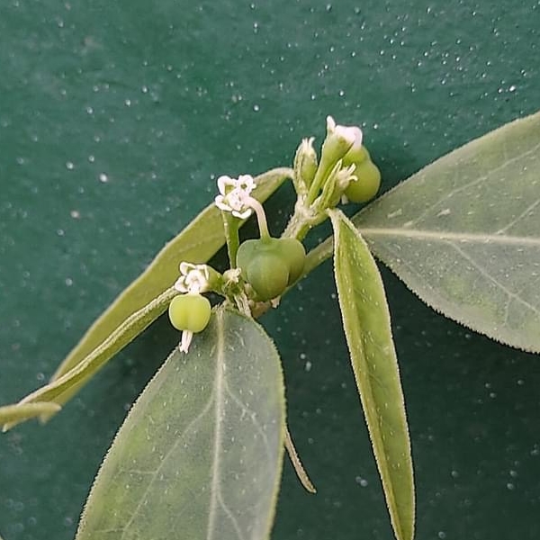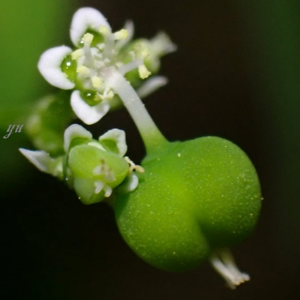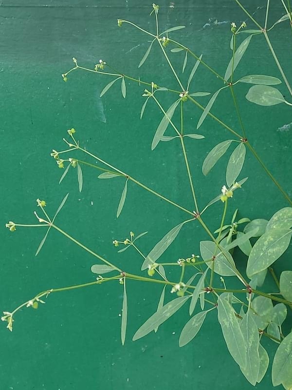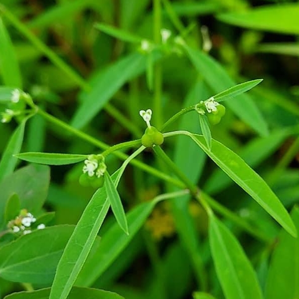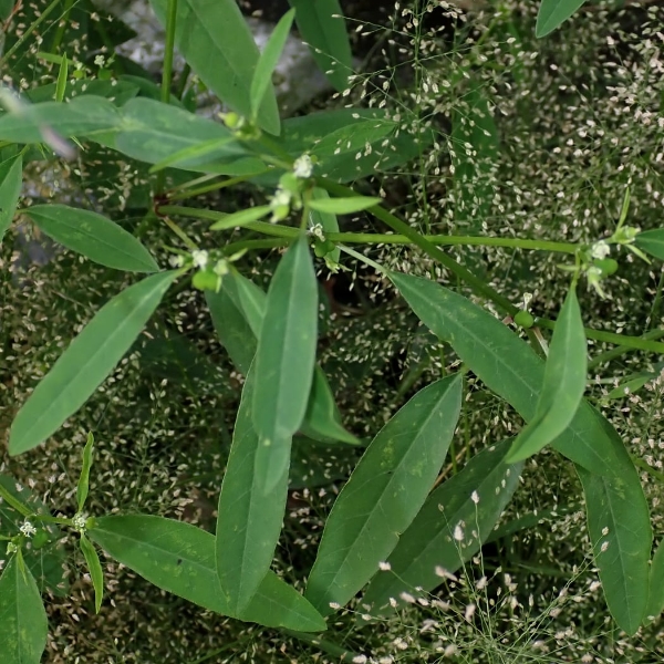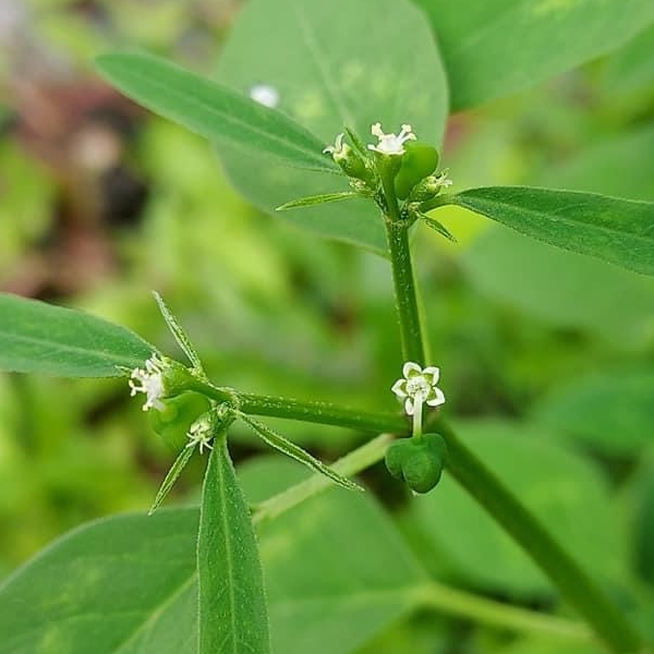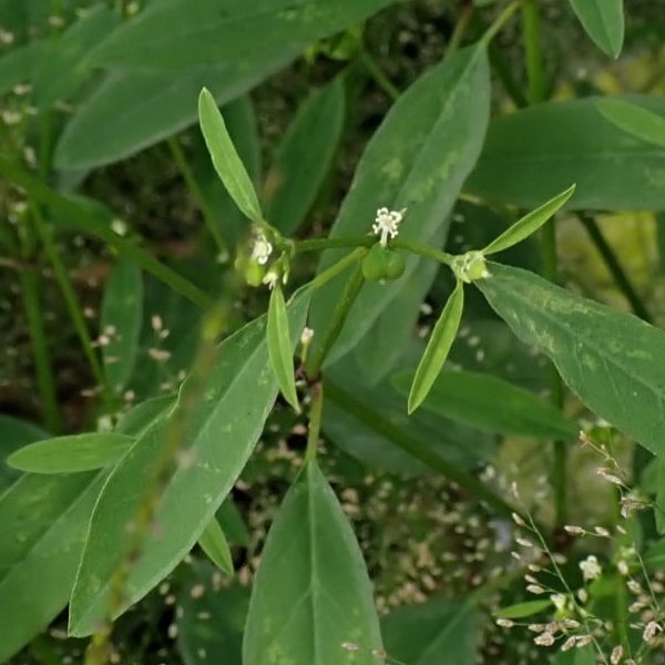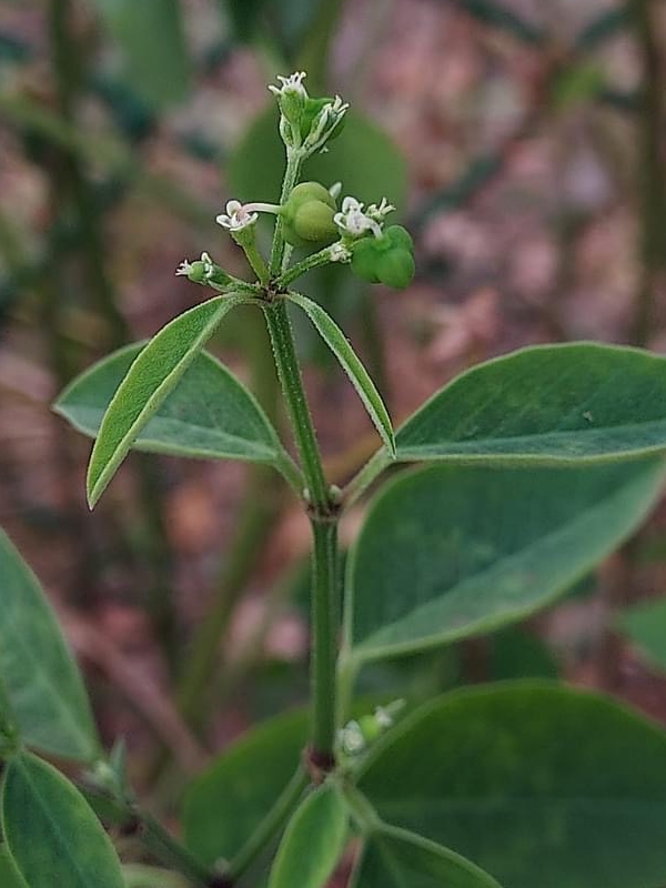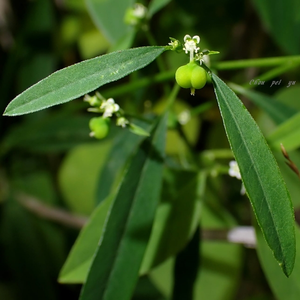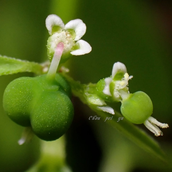 (歸化種;原生於中、南美洲;一年生直立草本;單葉對生,卵形、橢圓形至狹長橢圓形,全緣;大戟花序,頂生;蒴果3瓣狀)