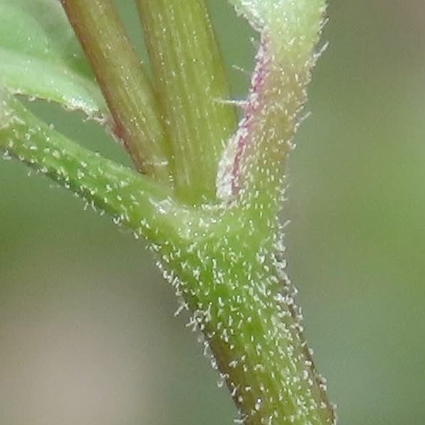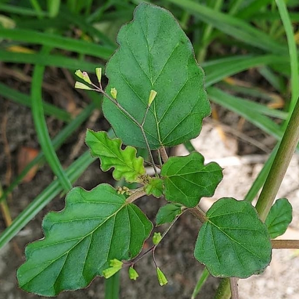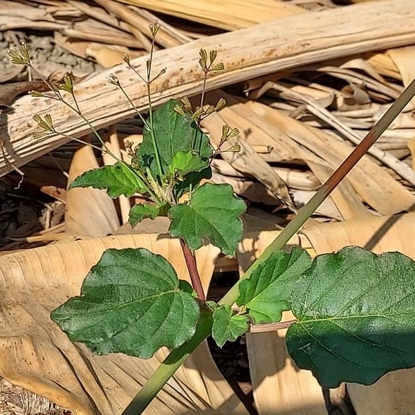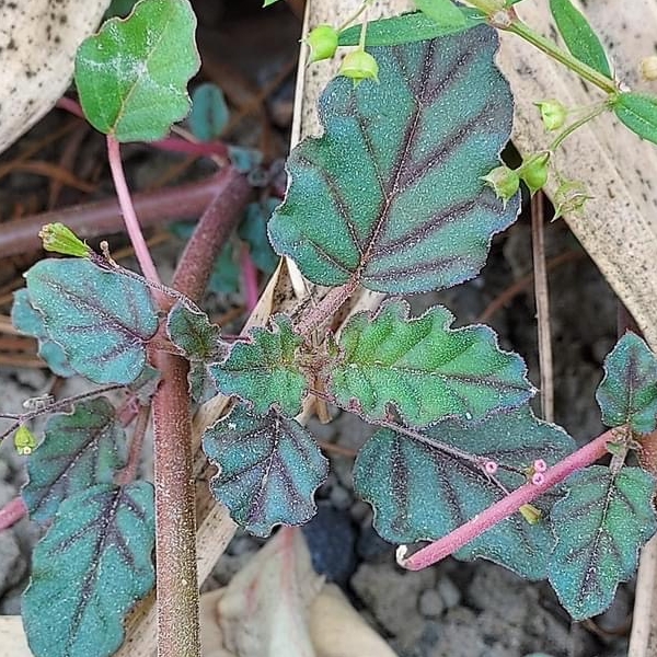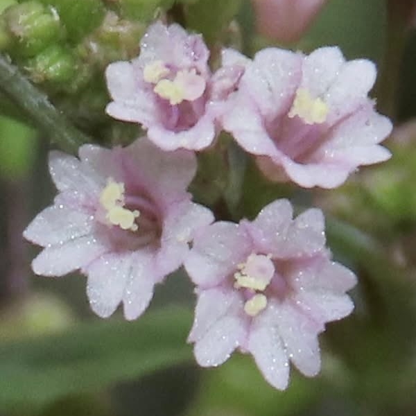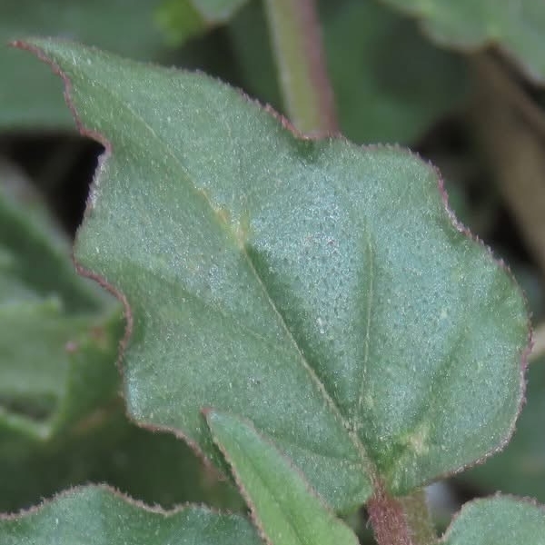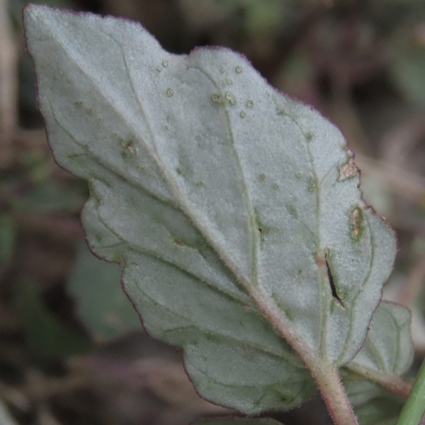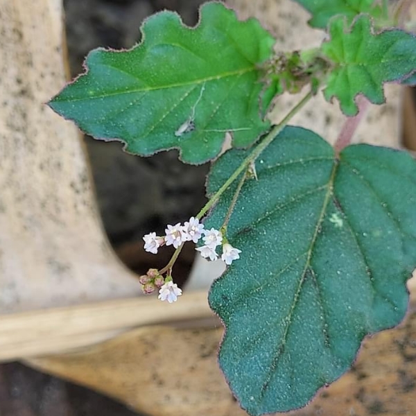 (歸化種;原生於中美洲及其附近一帶;多年生草本;單葉對生,闊卵形、卵形至卵狀披針形,波浪緣,葉背灰白色;聚繖花序,腋生或頂生;花瓣5枚,前端2裂;雄蕊2枚,雌蕊柱單一;果實表面不具短腺毛)
