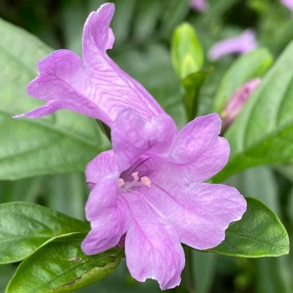(原生種;原生於台灣、中國大陸至中南半島一帶;半灌木;莖直立,高50~100公分,下部木質化,上部分枝,節處膨大;單葉,十字對生,卵形、橢圓形至倒長卵形,鋸齒緣至全緣,葉面光滑,先端漸尖,基部漸狹;上部分枝的開花莖葉片較小;花冠喇叭狀,花瓣5枚,淡粉紫色至紫色;雄蕊4枚,2強;蒴果,橢圓形,表面具網紋,宿存花萼線形,內含種子4枚;莖葉可作藍染材料,別名大青,「青」為藍色之意)