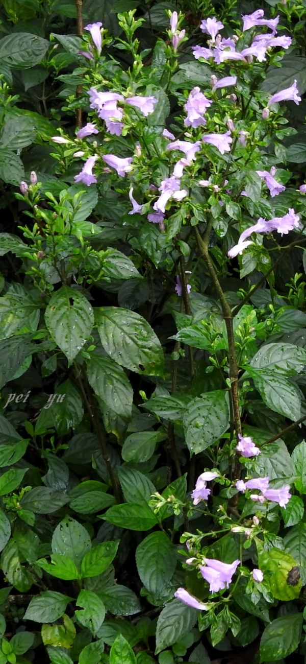 ![]() 上面照片:周佩玉拍攝 (半灌木;莖直立,高50~100公分,下部木質化,上部分枝;單葉,十字對生,卵形、橢圓形至倒長卵形,鋸齒緣,葉面光滑,先端漸尖,基部漸狹;上部分枝的開花莖葉片較小;花冠喇叭狀,花瓣5枚,淡粉紫色至紫色) |