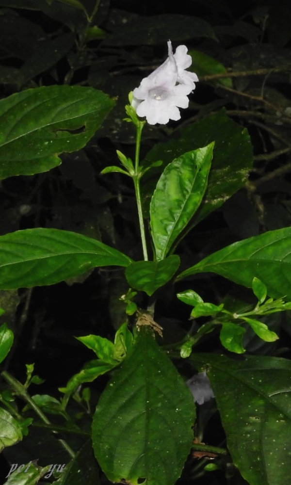 ![]() 上面照片:周佩玉拍攝 (半灌木;莖直立,高50~100公分,下部木質化,上部分枝,節處膨大;單葉,十字對生,卵形、橢圓形至倒長卵形,鋸齒緣,葉面光滑,先端漸尖,基部漸狹;上部分枝的開花莖葉片較小;花冠喇叭狀,花瓣5枚,淡粉紫色至紫色) |