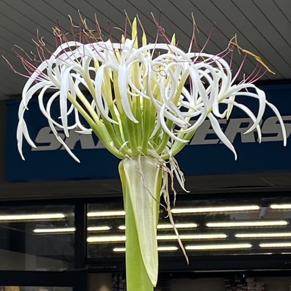 (原生種;原生於台灣、日本至印度和澳洲一帶;台灣物種名錄標名文珠蘭;多年生草本;單葉互生,劍形,叢生;繖形花序,花莖粗壯,腋生;總苞片2枚,披針形;花被6枚,白色;雄蕊6枚,花絲細長,桃紅色;花筒細長;蒴果近果形,頂端喙狀;果實可藉海漂傳播種子繁衍)