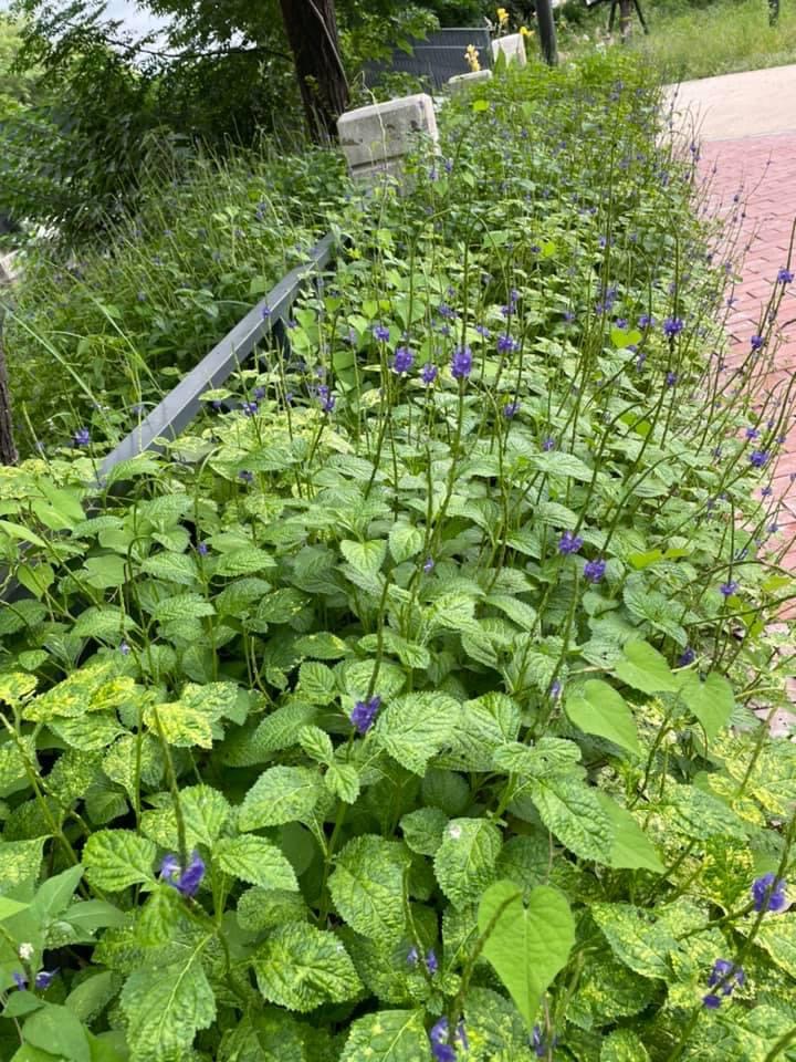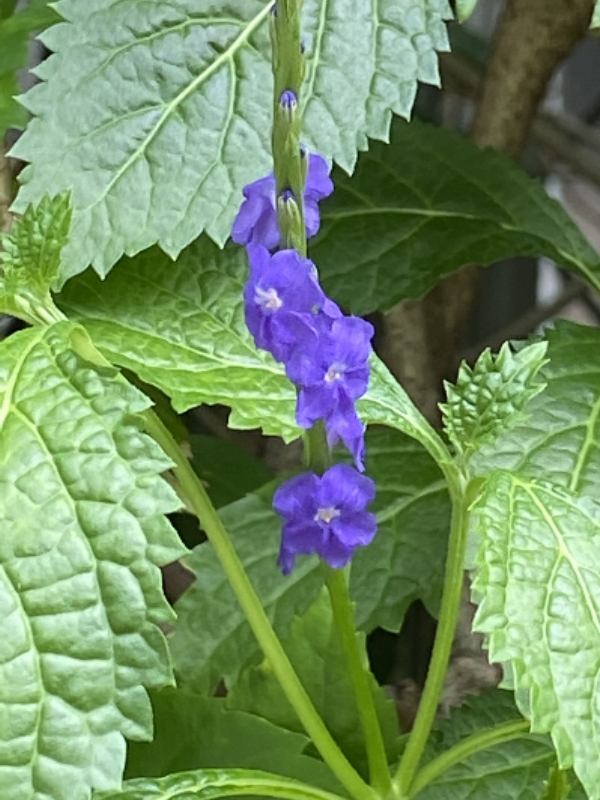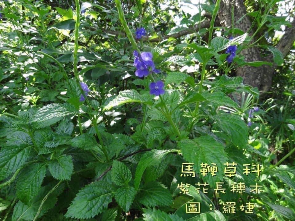 (歸化種;原生於南美洲北部;台灣物種名錄標名長穗木,別名木馬鞭、假敗醬;維基百科標名長穗木,別名木馬鞭、牙買加長穗木,附有照片(相符);香港柴娃娃植物網標名藍蝶猿尾木,附有照片;半灌木;葉面皺褶明顯;花色深藍紫)