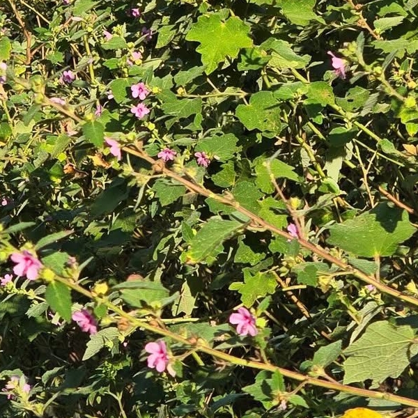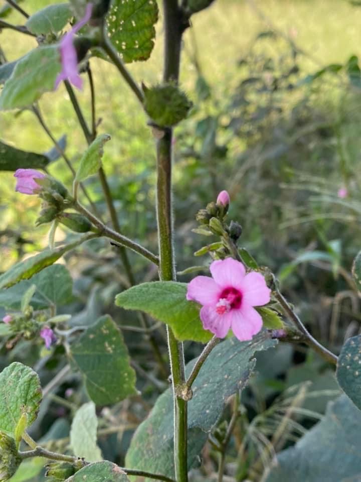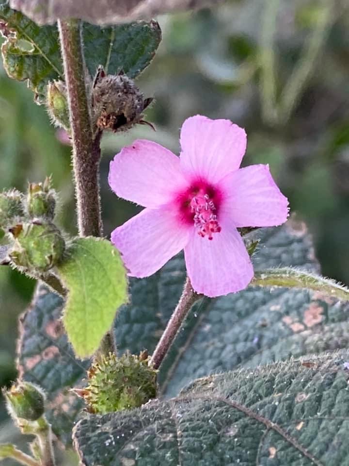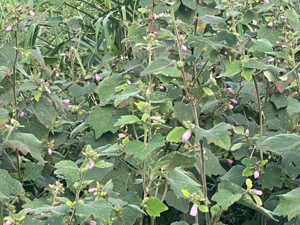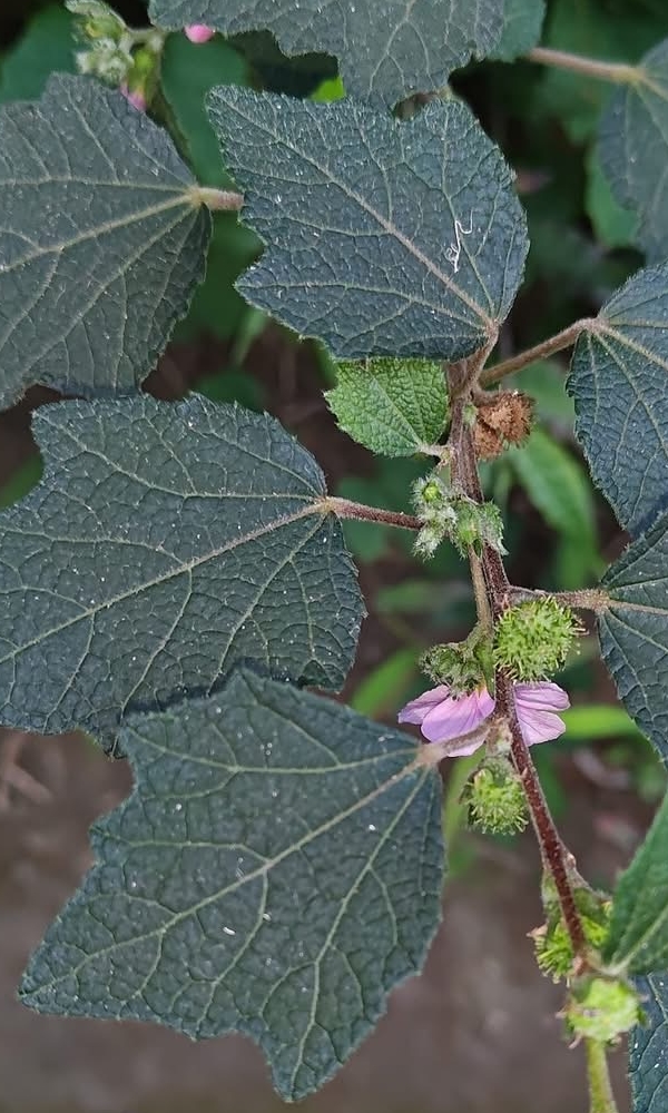 (原生種;原生於亞洲、非洲和美洲;台灣物種名錄標名野棉花,別名假棉花、紅虱母子、虱母子,附有照片;維基百科標名地桃花;半灌木;全株被毛;單葉互生,圓形、卵形至淺裂掌形,葉柄細長(2~4公分);花序腋生,單生或成聚繖花序;花瓣5枚,粉紅或白色;蕊柱合生,雄蕊多數,雌蕊花柱10叉;花萼有2層,內外層長度相當;蒴果5瓣狀,密被棘刺,棘刺末端有星狀的小倒鉤刺,可藉由動物沾粘傳播種子)