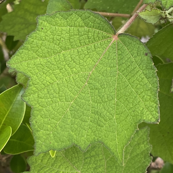 ![]() 上面照片:林美燕拍攝 (單葉互生,圓形、卵形至淺裂掌形,葉柄細長(2~4公分)) |