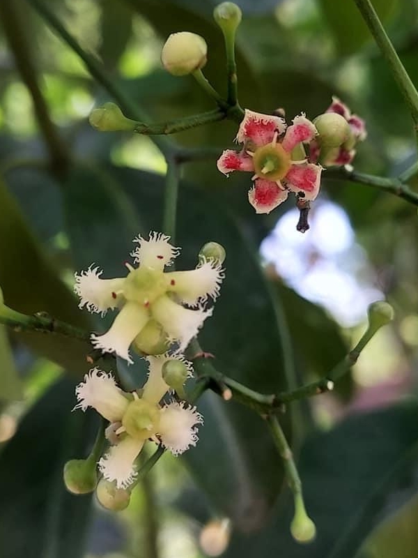 ![]() 上面照片:小花老師拍攝於台北植物園 (複聚繖花序,腋生;花瓣5枚,先端流蘇狀,初發淡綠色,後轉粉紅色) |