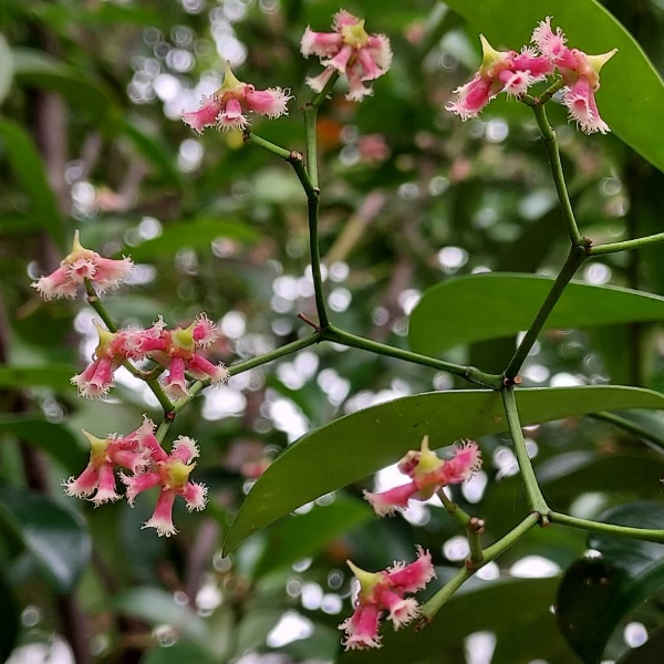 (原生種;世界植物在線 POWO 標示原生於印度、中南半島至新幾內亞島(包含菲律賓,不含台灣);台灣物種名錄標示為原生種(台灣原產於蘭嶼);交趾是越南的古稱,越南是原生地之一;常綠灌木;主莖直立,株高可達4公尺;單葉,3葉輪生或對生,倒卵形、橢圓形至長橢圓形,全緣,革質;複聚繖花序,腋生;花瓣5枚,先端流蘇狀,初發淡綠色,後轉粉紅色;雄蕊5枚;蒴果倒卵形,5瓣狀,成熟紅色;內含種子2~5枚,黑色)