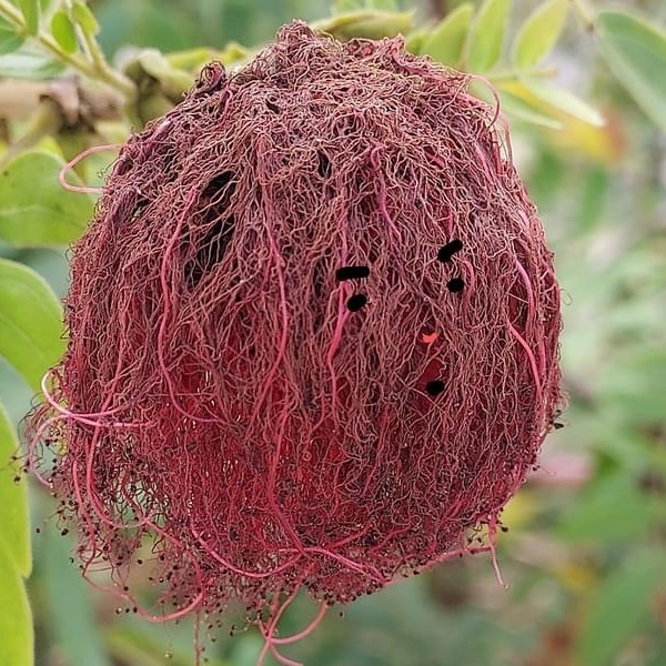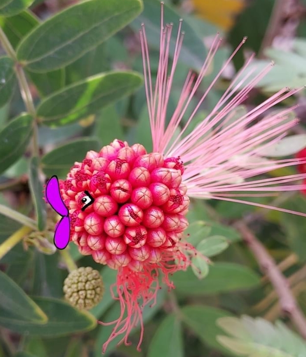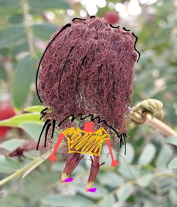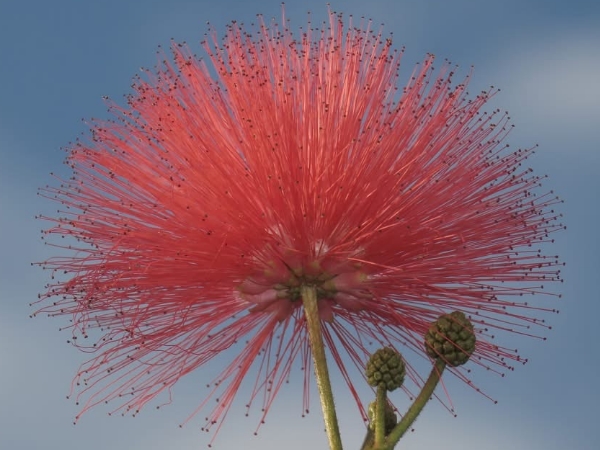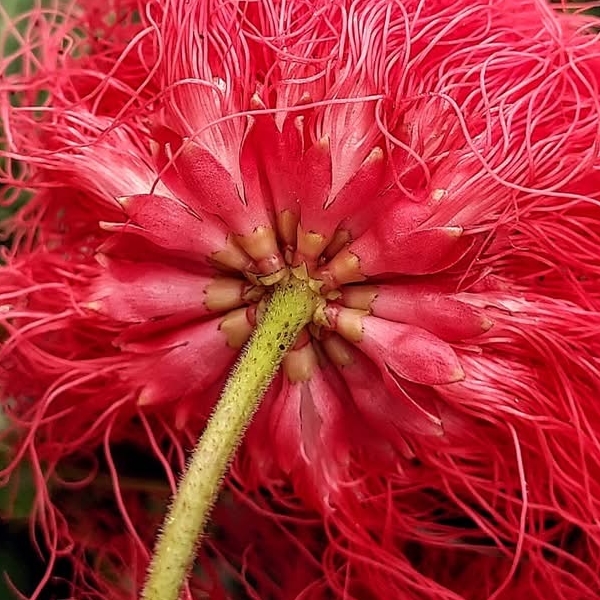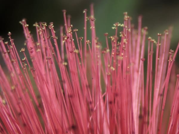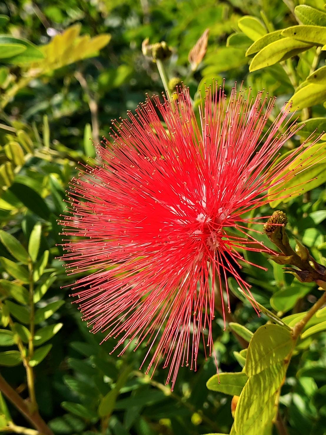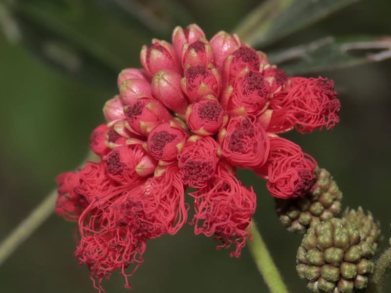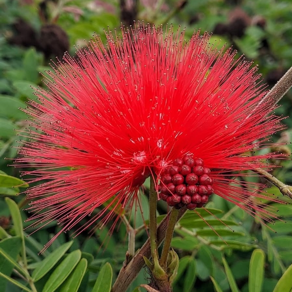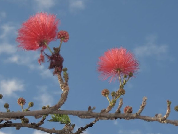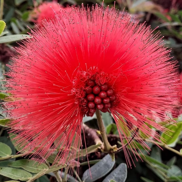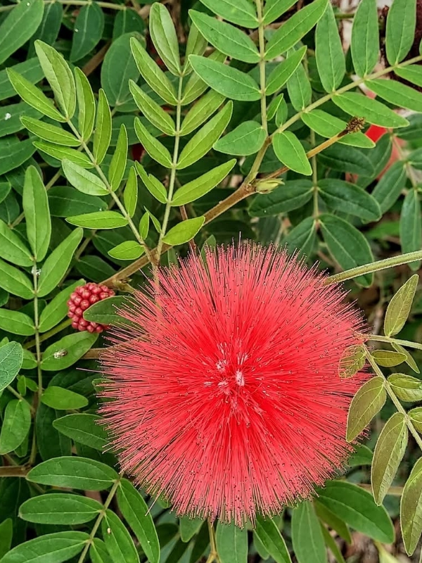 (歸化種;原生於南美洲的玻利維亞;台灣物種名錄標名美洲合歡,別名紅合歡;維基百科標名朱纓花;灌木;高度2~4公尺;二回偶數羽狀複葉,互生;小羽片1對,小羽片的小葉5~7對,歪長卵形;頭狀花序,腋生,總梗細長;雄蕊花絲細長,紅色;莢果長條扁平狀;與粉撲花 Calliandra surinamensis 是不同的植物)
