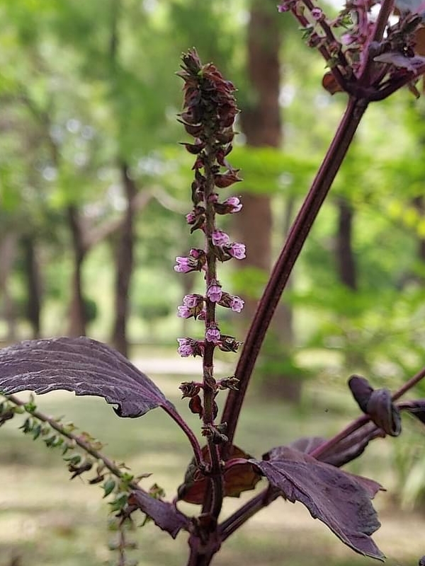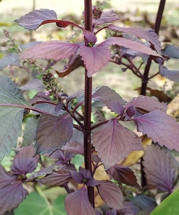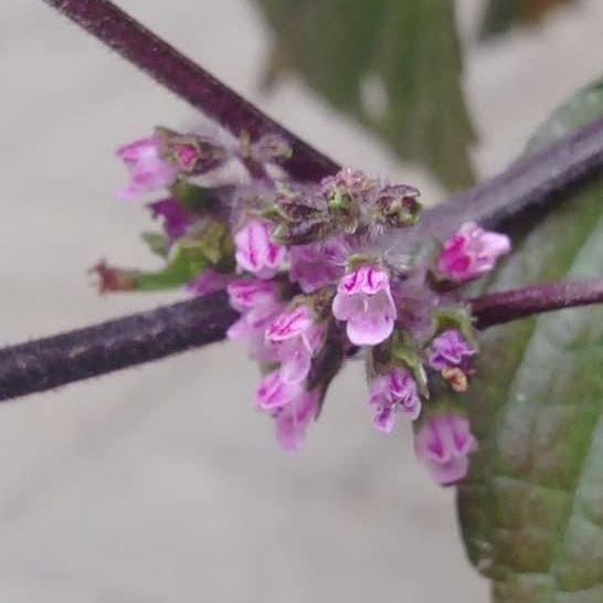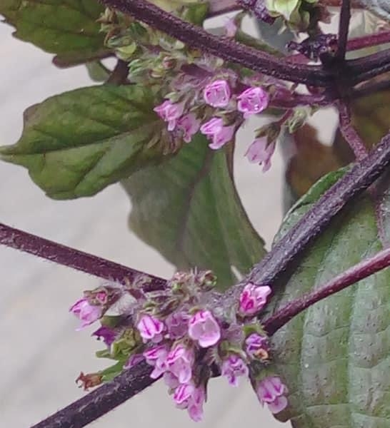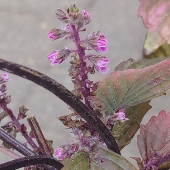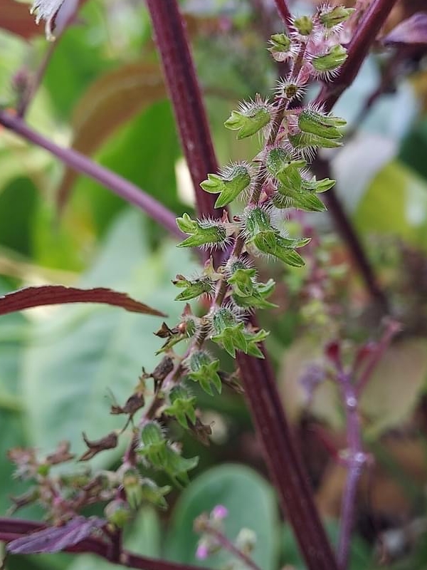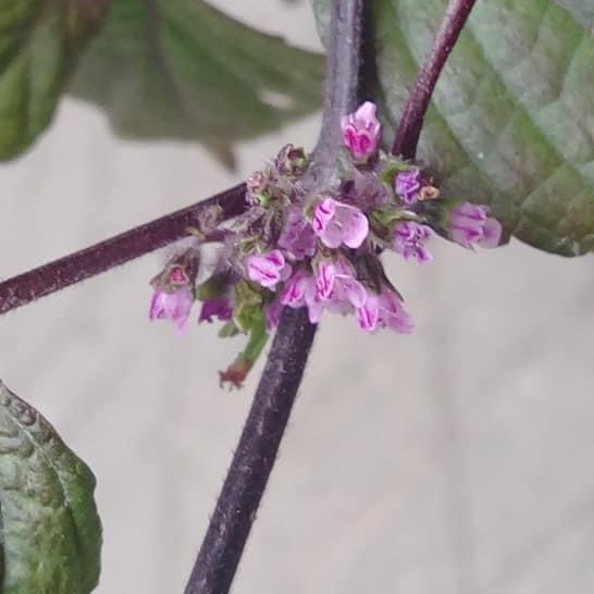(原生種或歸化種;世界植物在線 POWO 標示原生於日本至印度,包含台灣;台灣物種名錄標名紫蘇,別名荏,標示為歸化種;韓國俗稱芝麻葉;維基百科將變種的紫蘇 Perilla frutescens var. crispa,標名回回蘇,坊間所稱的紅紫蘇和青紫蘇皆屬於回回蘇的種類之一;一年生草本;全株密被柔毛;單葉對生,卵形,鋸齒緣,兩面被毛;總狀花序,腋生或頂生;花朵小型,花冠筒狀,2唇型,粉紅色至白色;花萼密被長柔毛;蒴果花萼宿存,花萼齒狀)