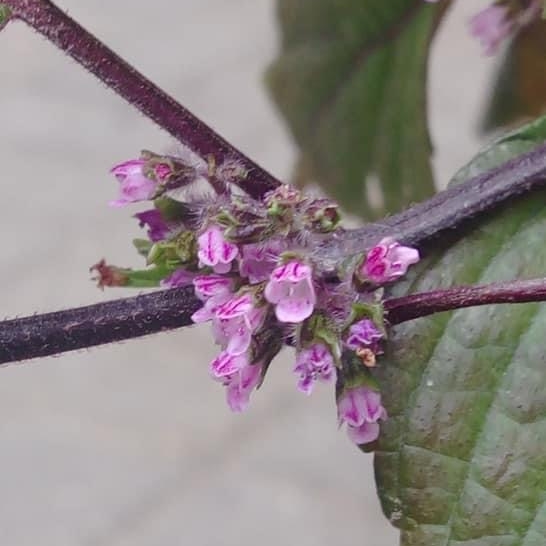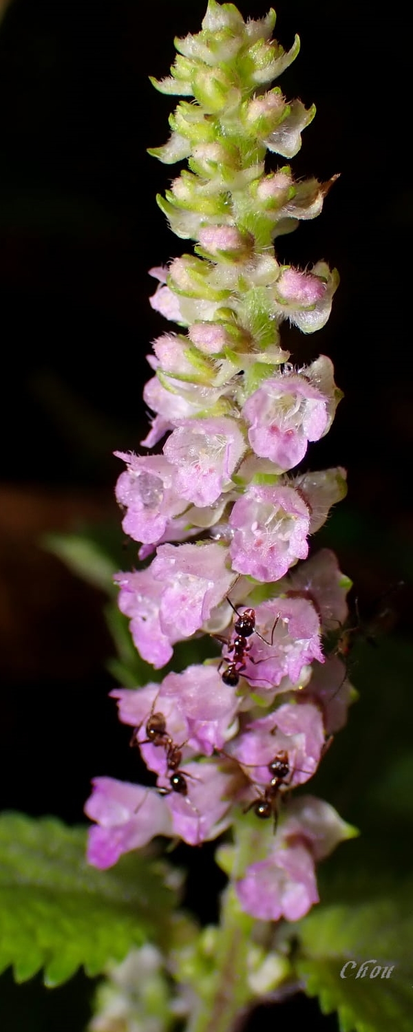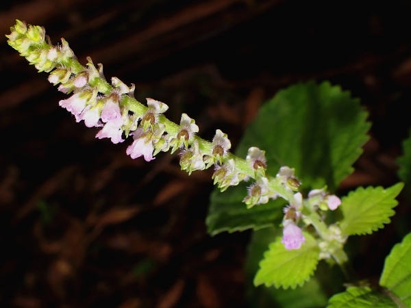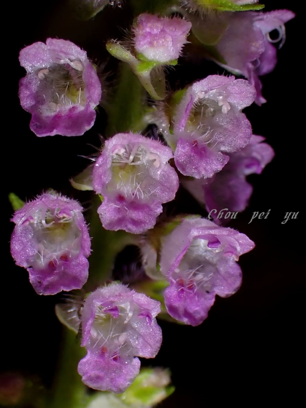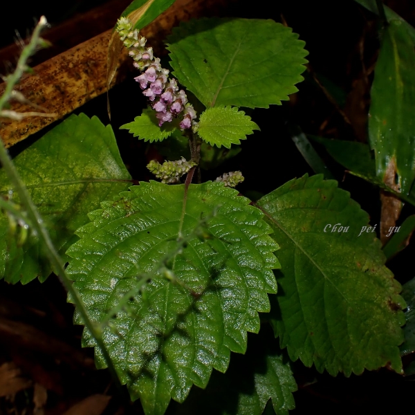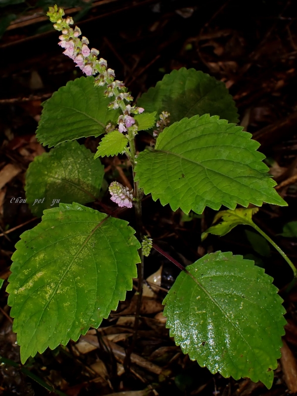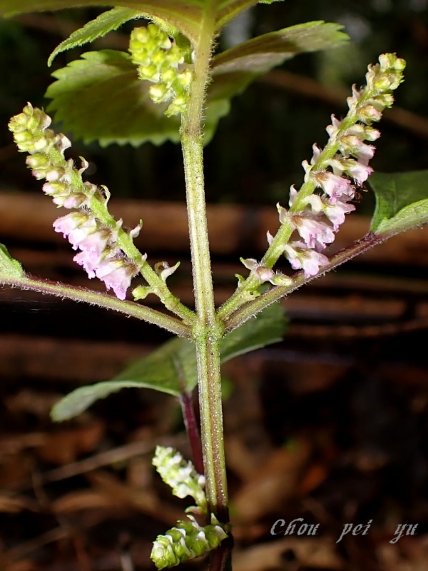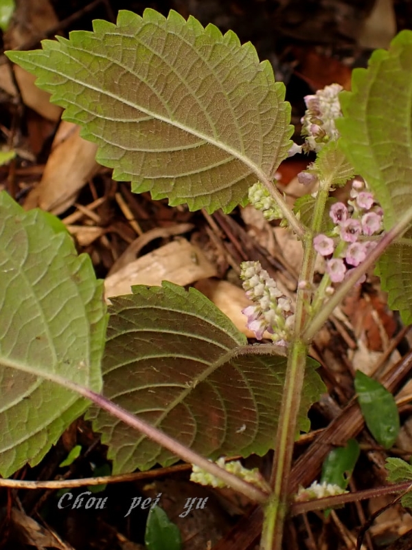 ![]() 上面照片:陳維琪拍攝 (單葉對生,卵形,鋸齒緣,兩面被毛;總狀花序,腋生或頂生) |