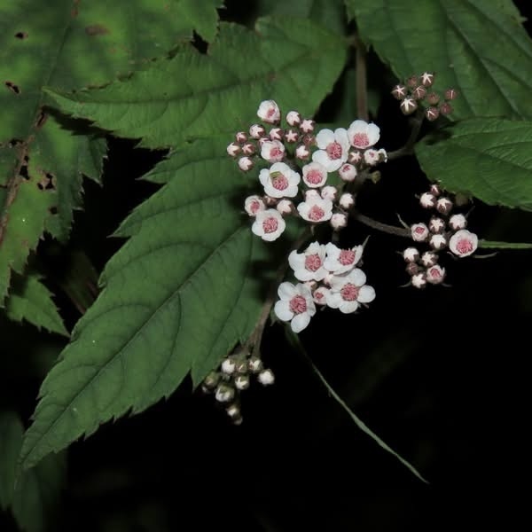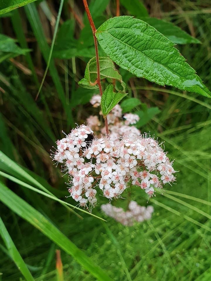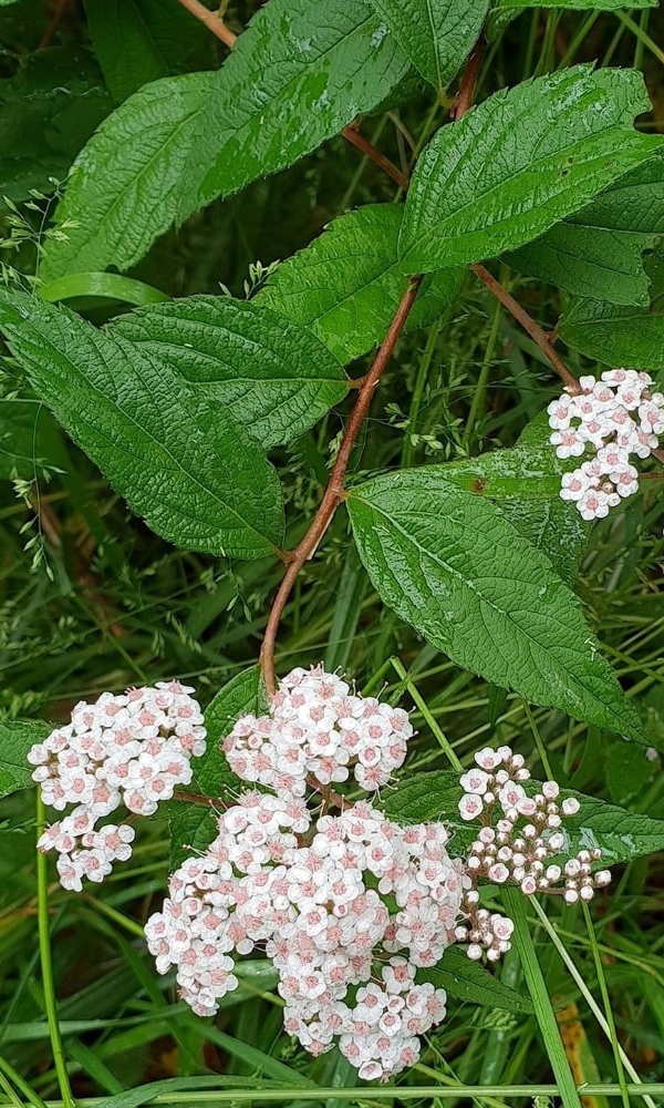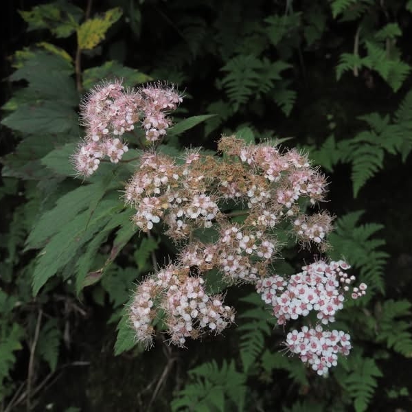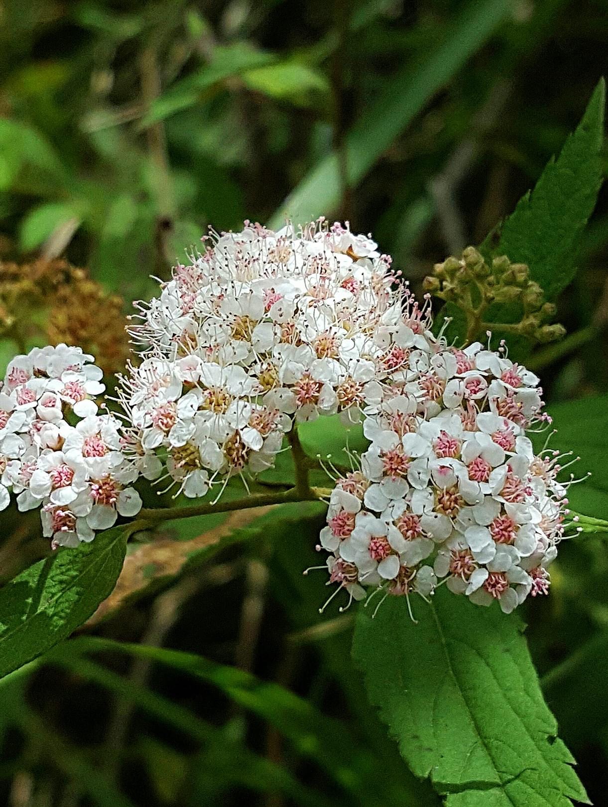 (台灣特有種;世界植物在線 POWO 標示 Spiraea formosana = Spiraea japonica var. formosana,皆為有效學名,標示原產於台灣,為台灣特有種;落葉灌木;小枝密被毛;單葉互生,長卵形至狹長橢圓形,重鋸齒緣,具短柄;葉背灰綠,被毛;聚繖花序,頂生;花瓣5枚,白色;雄蕊多數,花絲細長,花藥粉紅色;柱頭5枚)
