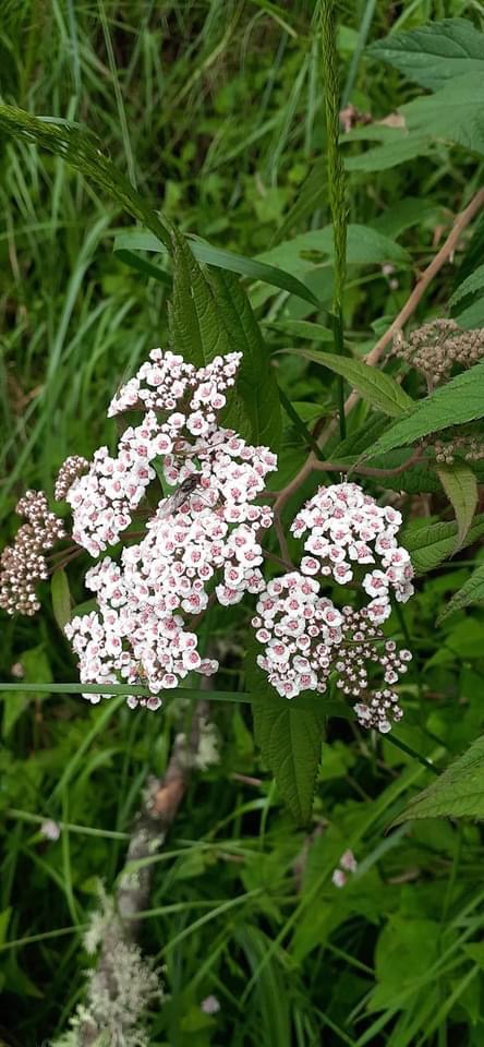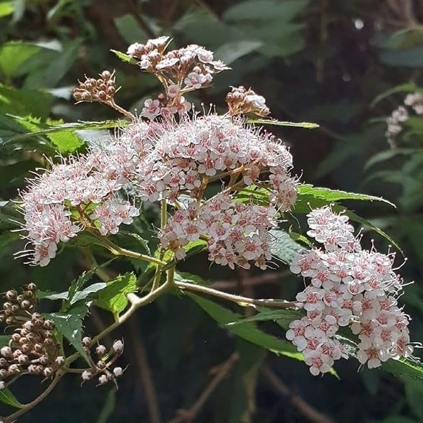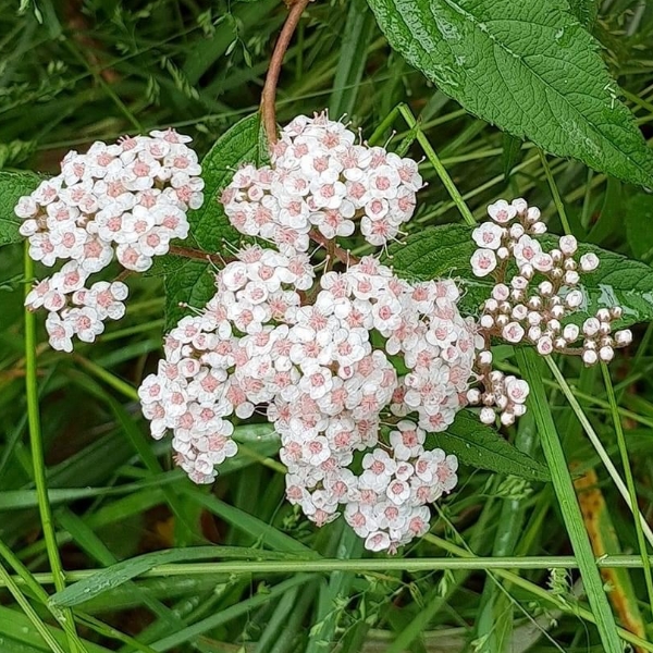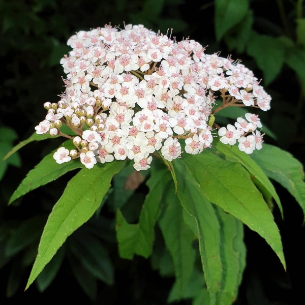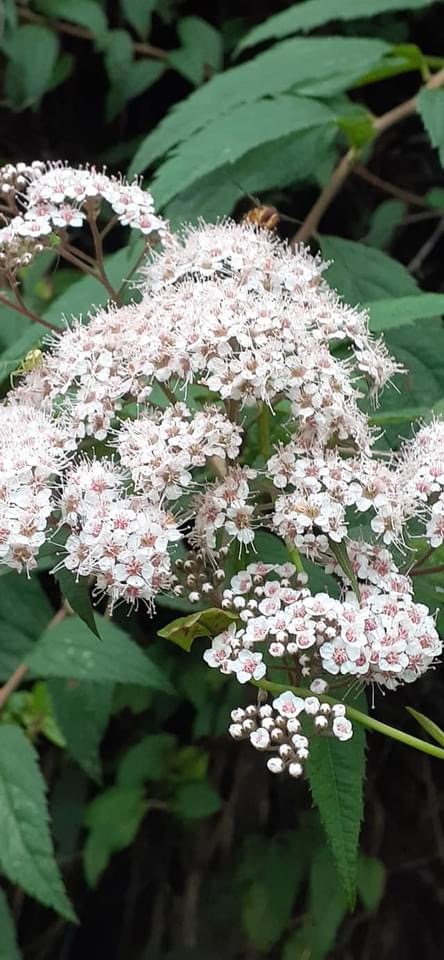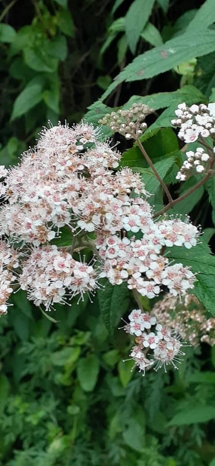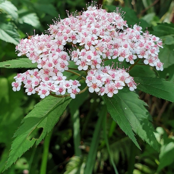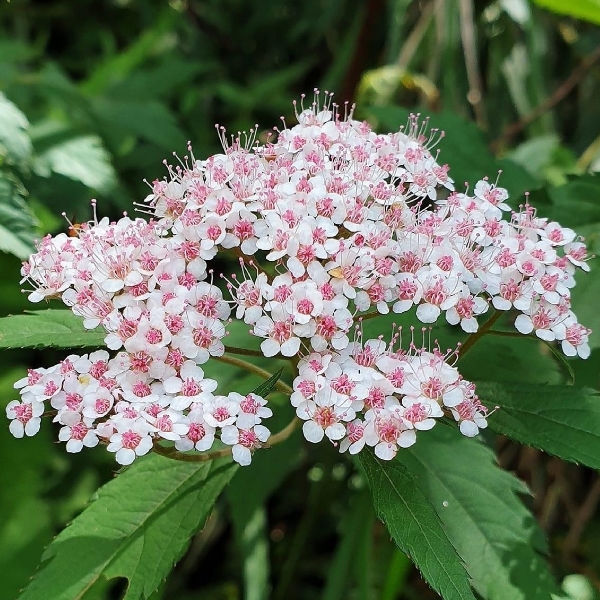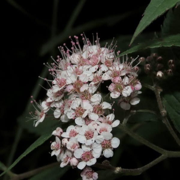 (台灣特有種;世界植物在線 POWO 標示 Spiraea formosana = Spiraea japonica var. formosana,皆為有效學名,標示原產於台灣,為台灣特有種;落葉灌木;小枝密被毛;單葉互生,長卵形至狹長橢圓形,重鋸齒緣,具短柄;葉背灰綠,被毛;聚繖花序,頂生;花瓣5枚,白色;雄蕊多數,花絲細長,花藥粉紅色;柱頭5枚)