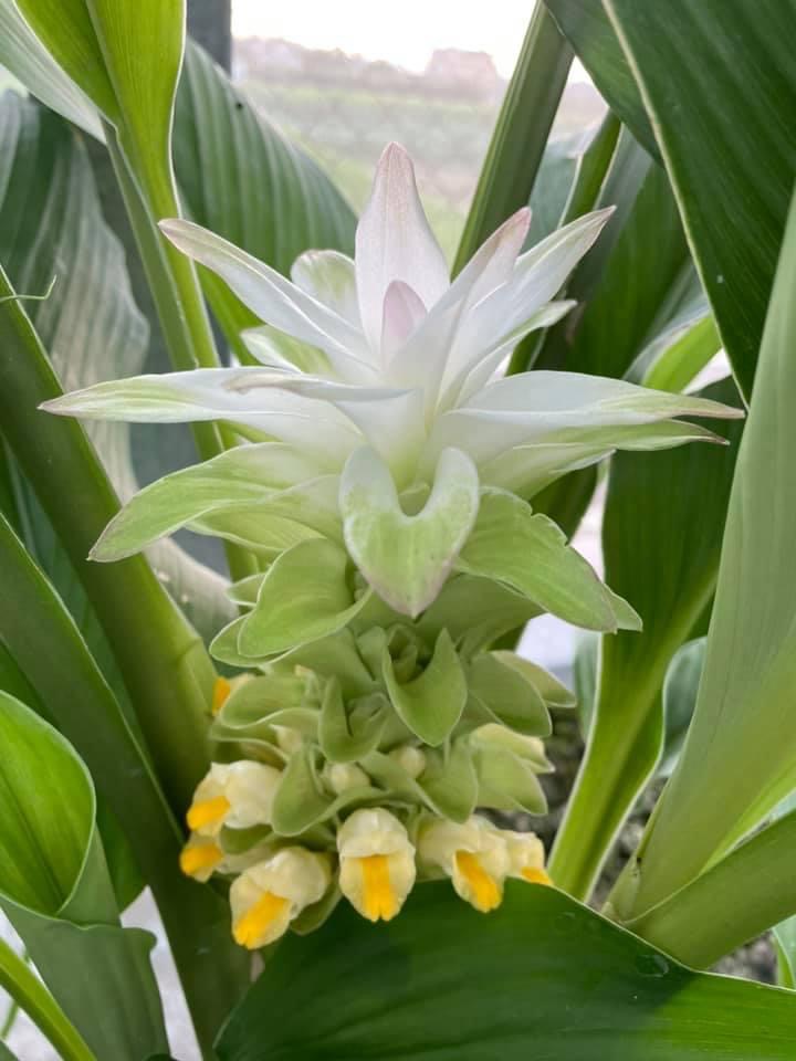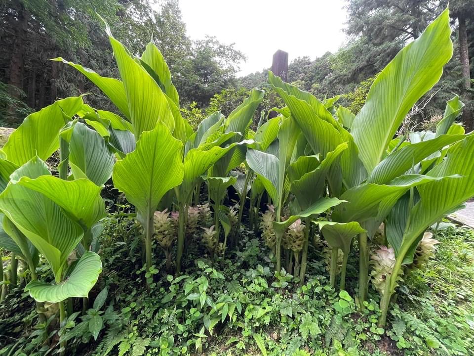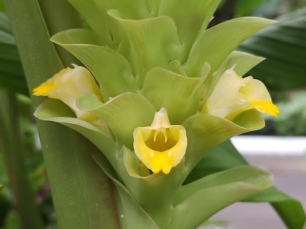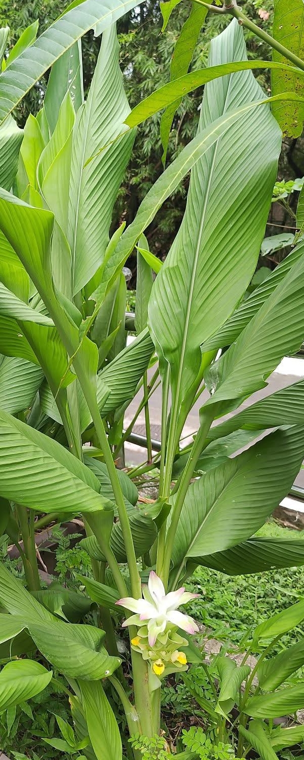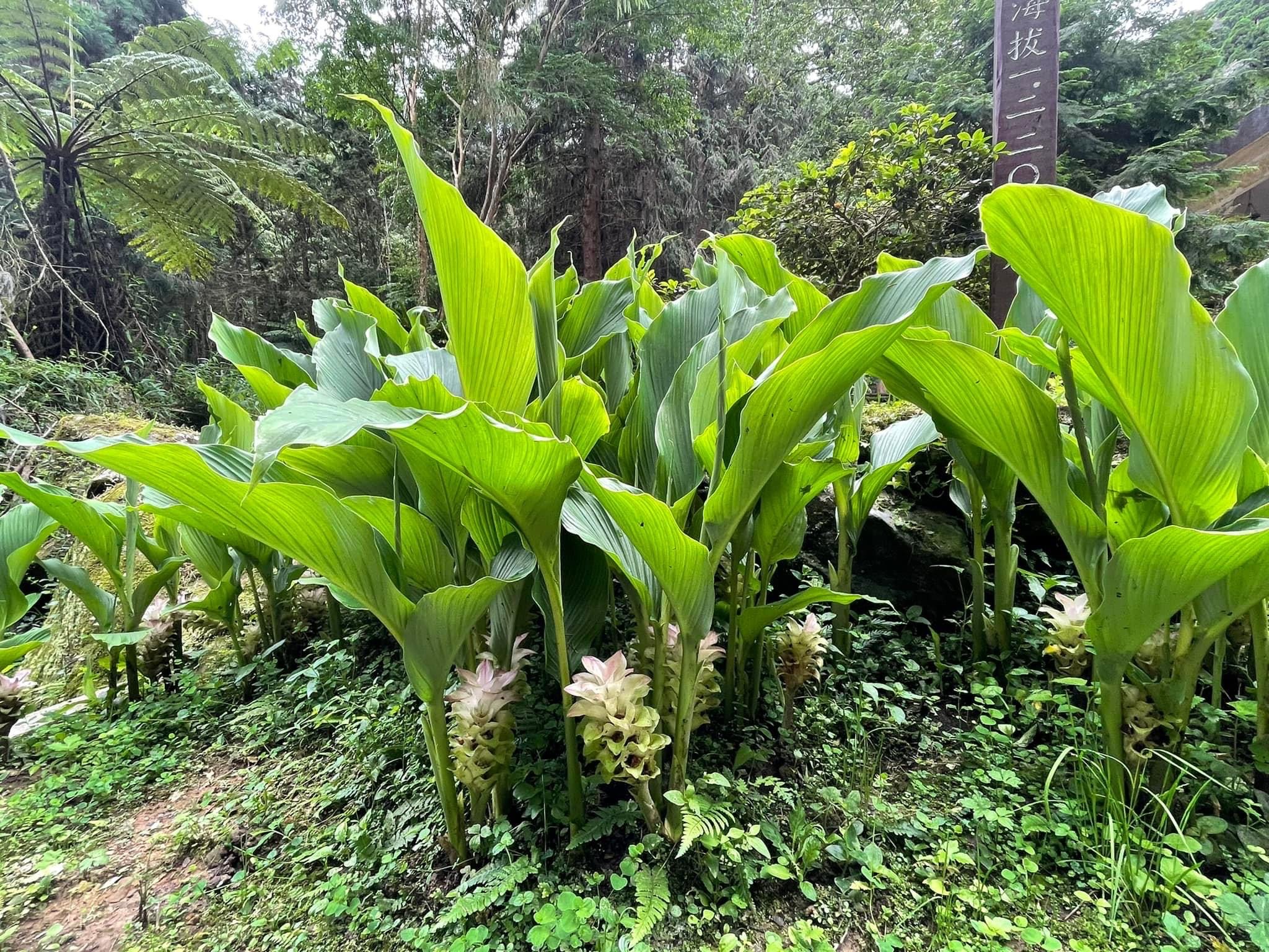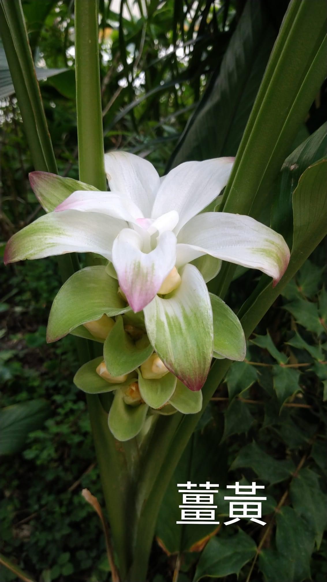 (歸化種;世界植物在線 POWO 標示 Curcuma domestica = Curcuma longa,皆為有效學名,附有照片,標示原產於印度;台灣物種名錄將 Curcuma longa 標名薑黃;維基百科將 Curcuma longa 標名薑黃,別名寶鼎香;中國植物智標名姜黃;花序上半部的苞片端部常帶粉紫色;花冠黃色)