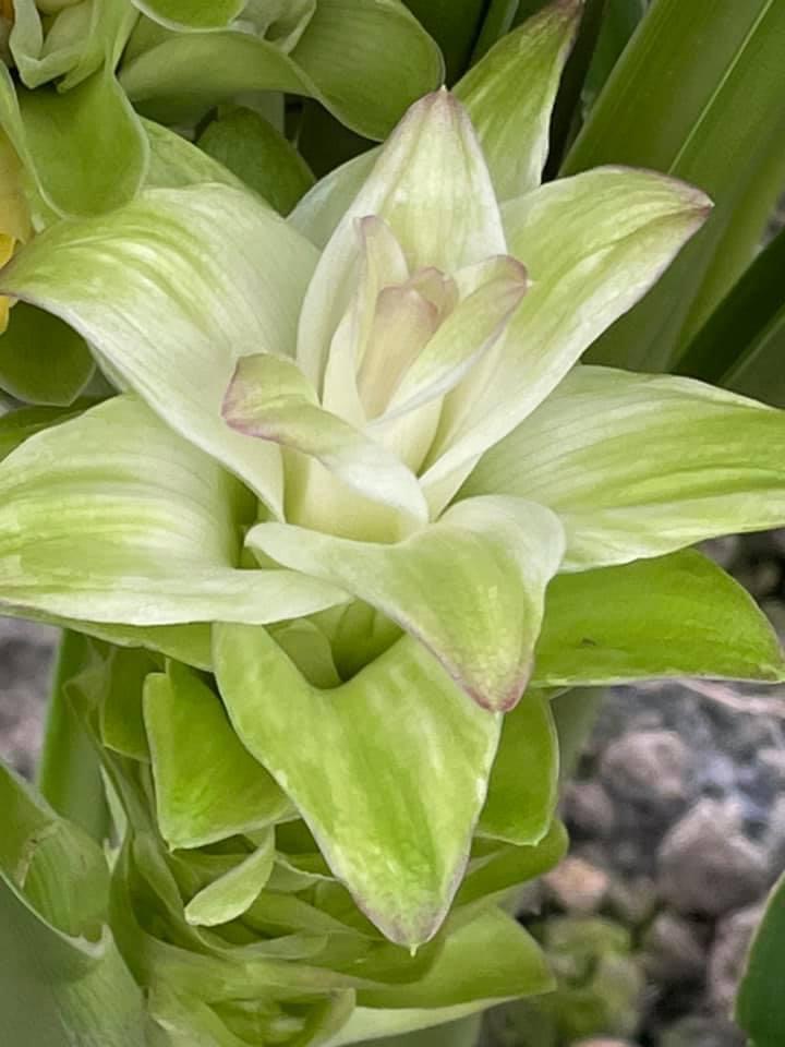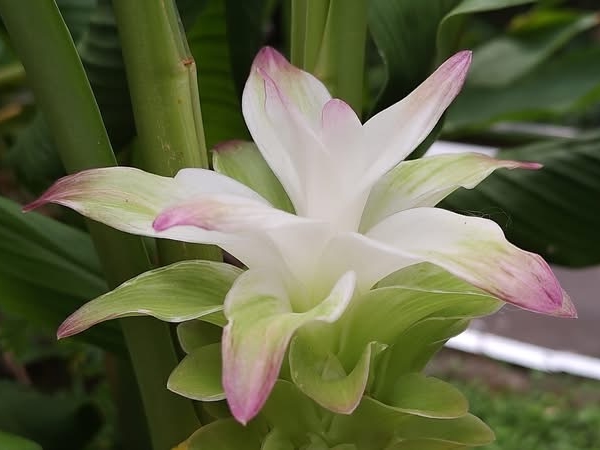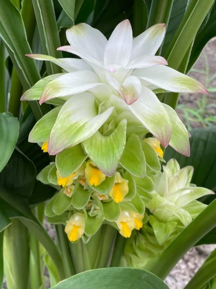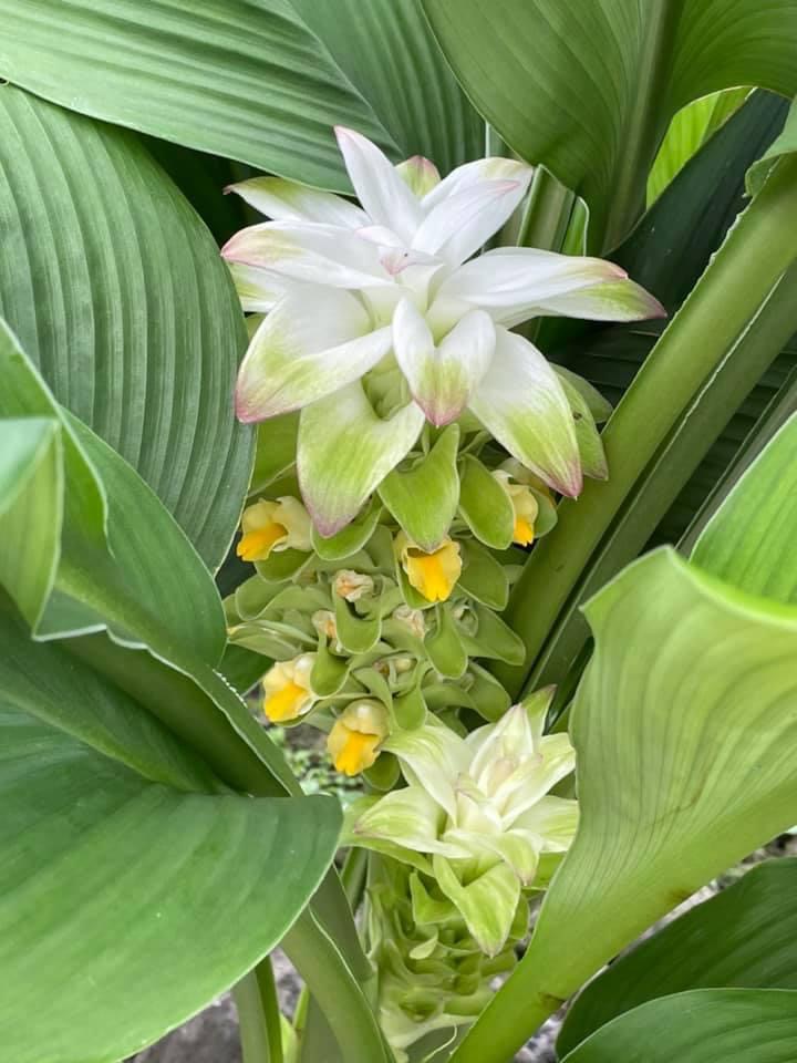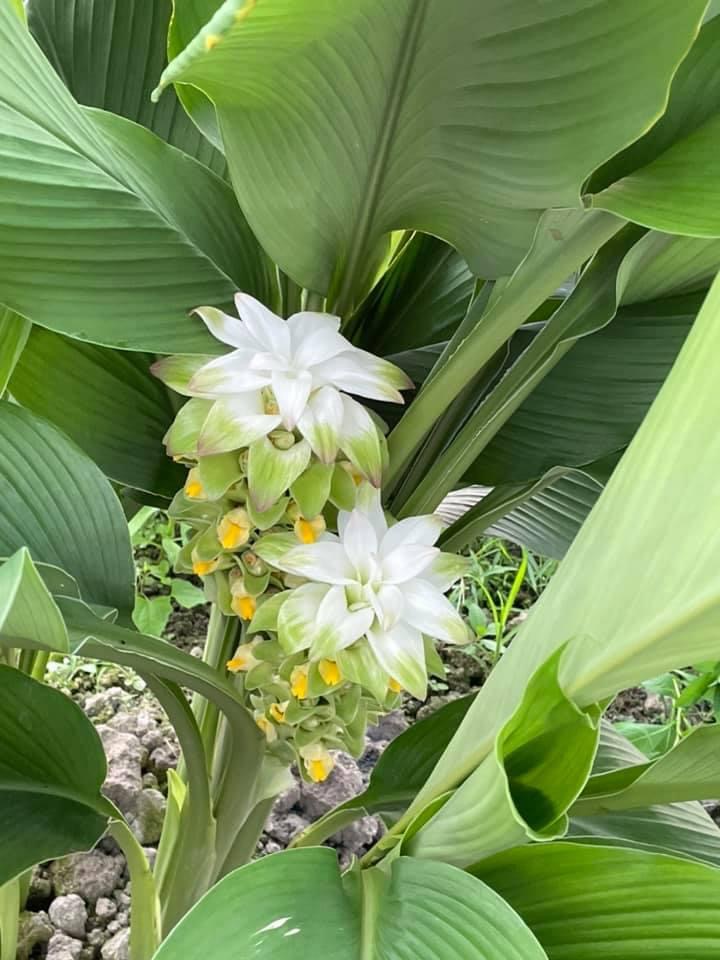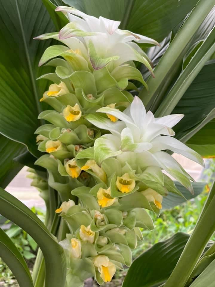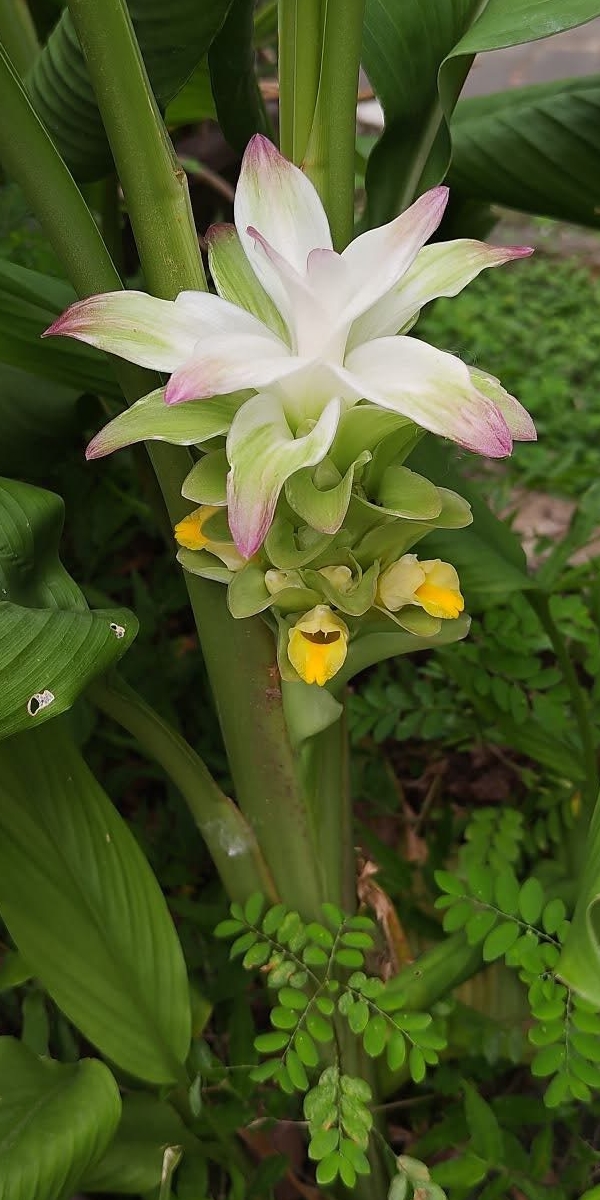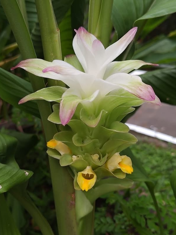(歸化種;世界植物在線 POWO 標示 Curcuma domestica = Curcuma longa,皆為有效學名,附有照片,標示原產於印度;台灣物種名錄將 Curcuma longa 標名薑黃;維基百科將 Curcuma longa 標名薑黃,別名寶鼎香;中國植物智標名姜黃;花序上半部的苞片端部常帶粉紫色;花冠黃色)