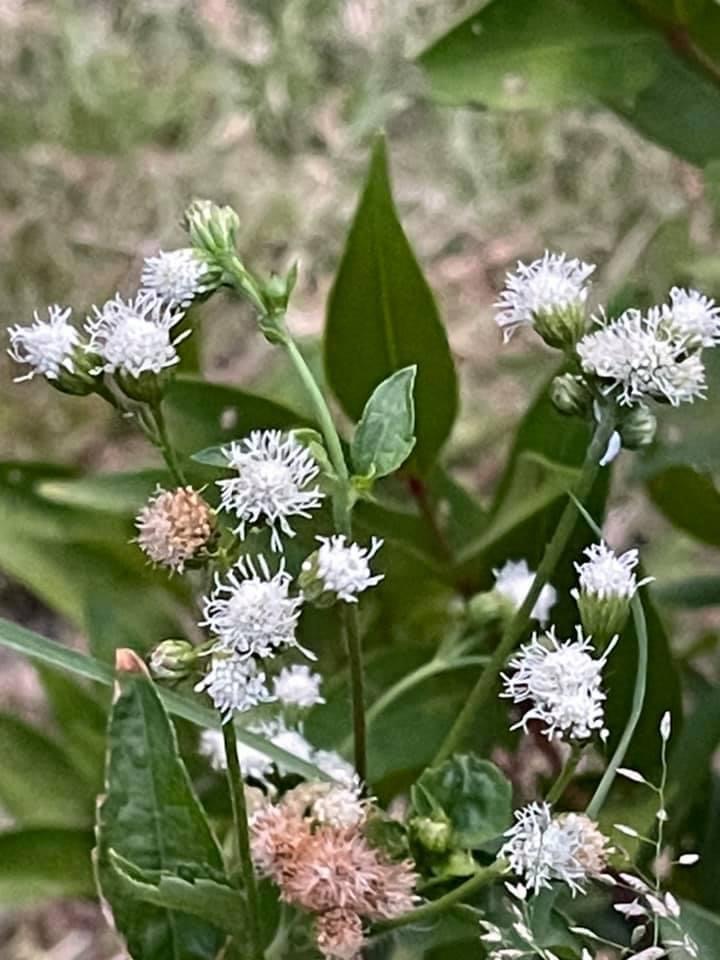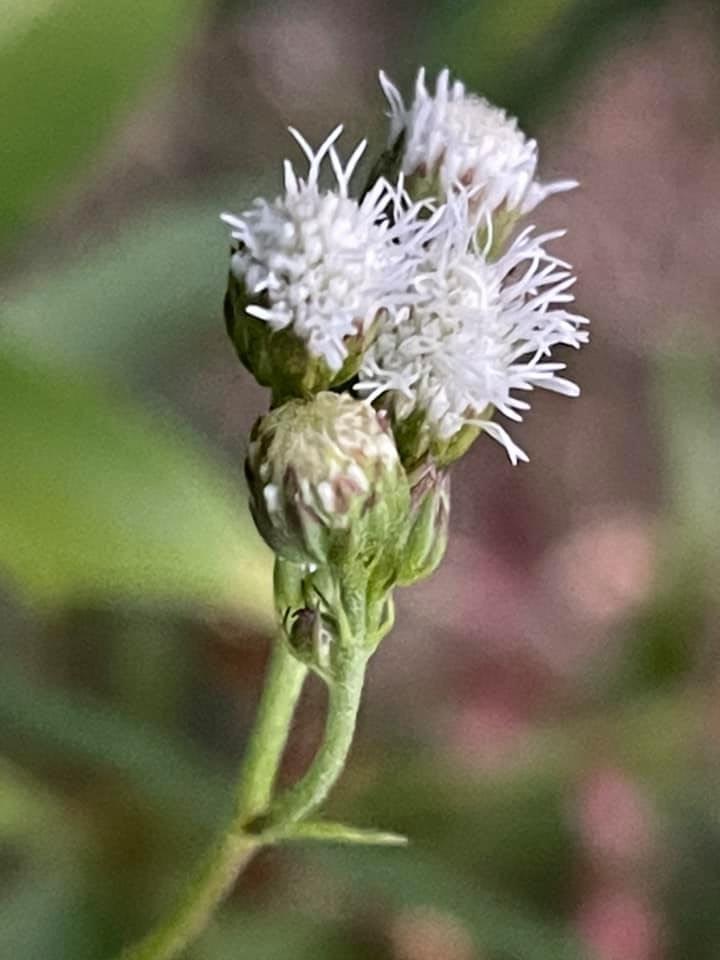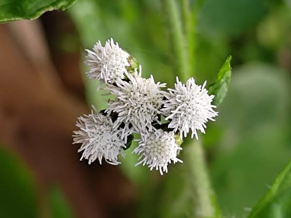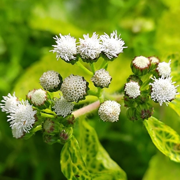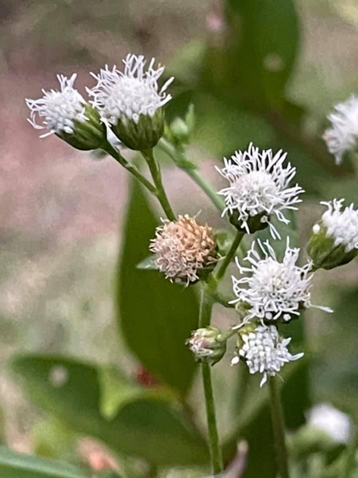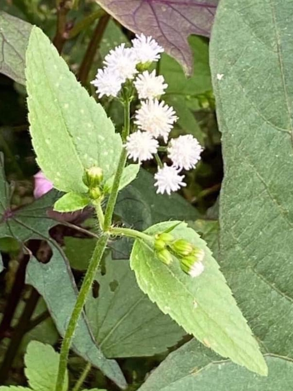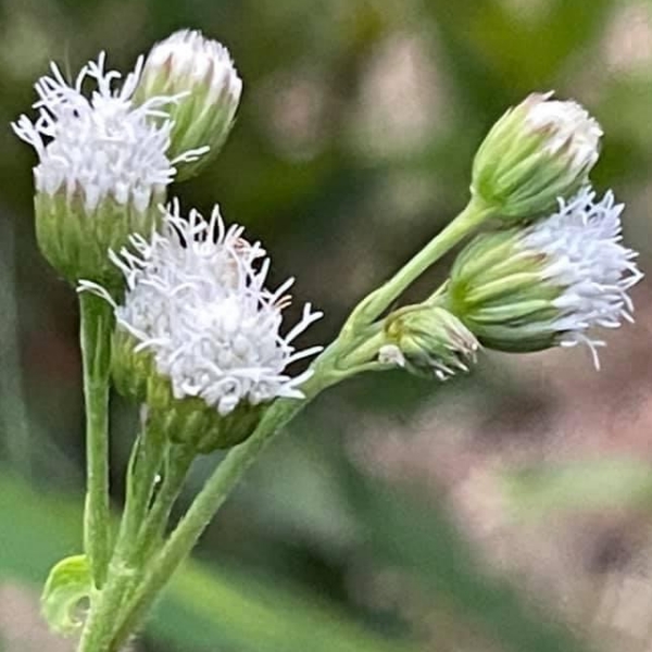 (歸化種;原生於北美洲的墨西哥附近一帶;一年生草本;全株密被細毛;單葉對生,三角狀卵形至長卵形,鋸齒緣,具葉柄;頭狀花序,全為管狀花,總苞多層;頭花於枝端排成繖房狀或圓錐狀花序;小花花瓣5枚甚小;花柱2叉,特長,白色;葉片輕揉,具特殊氣味,其汁液可解除蚊蟲叮咬之癢)