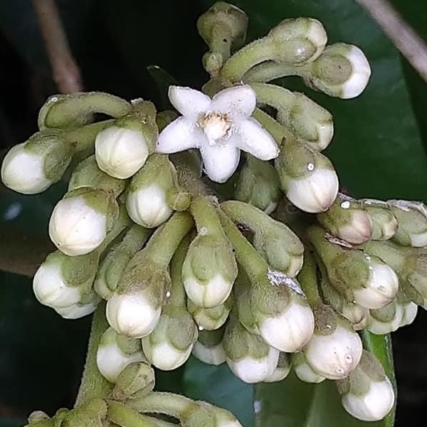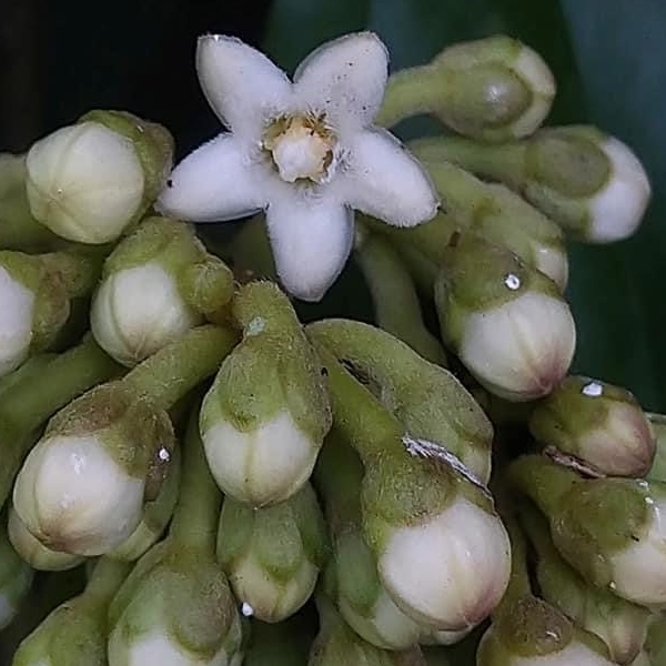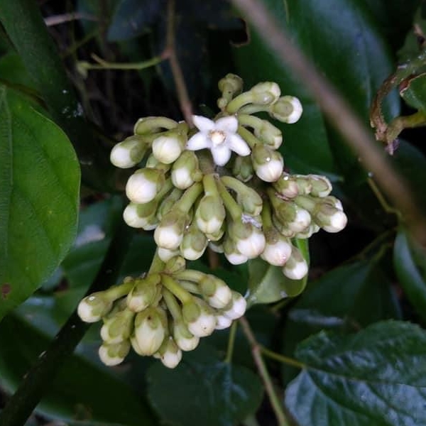 ![]() 上面照片:廖金枝拍攝 (繖形花序,腋生,呈球狀;花瓣5枚,白色至淡黃色) |