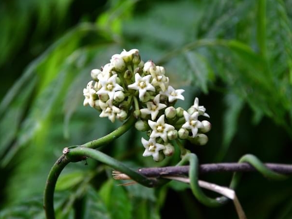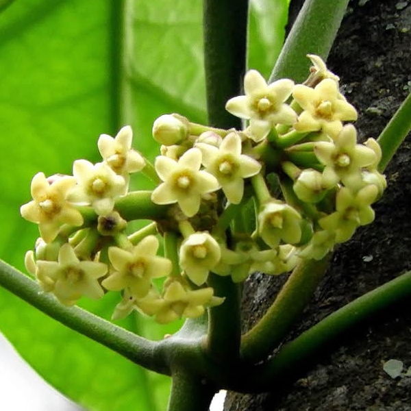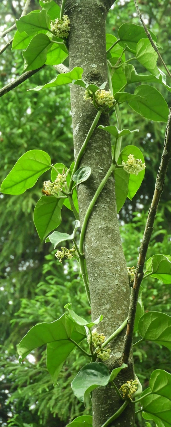 ![]() 上面照片:廖金枝拍攝 (纏繞性木質藤本;全株密被細絨毛;莖右旋纏繞;單葉對生,闊卵形;繖形花序,腋生,呈球狀;花瓣5枚,白色至淡黃色) |