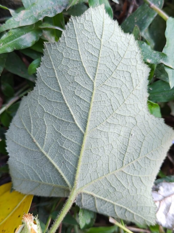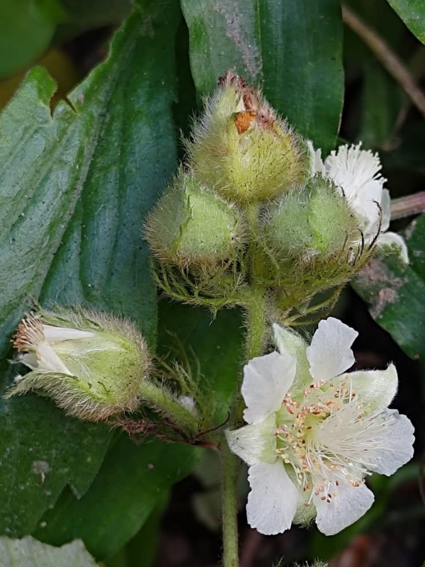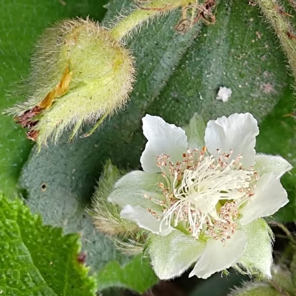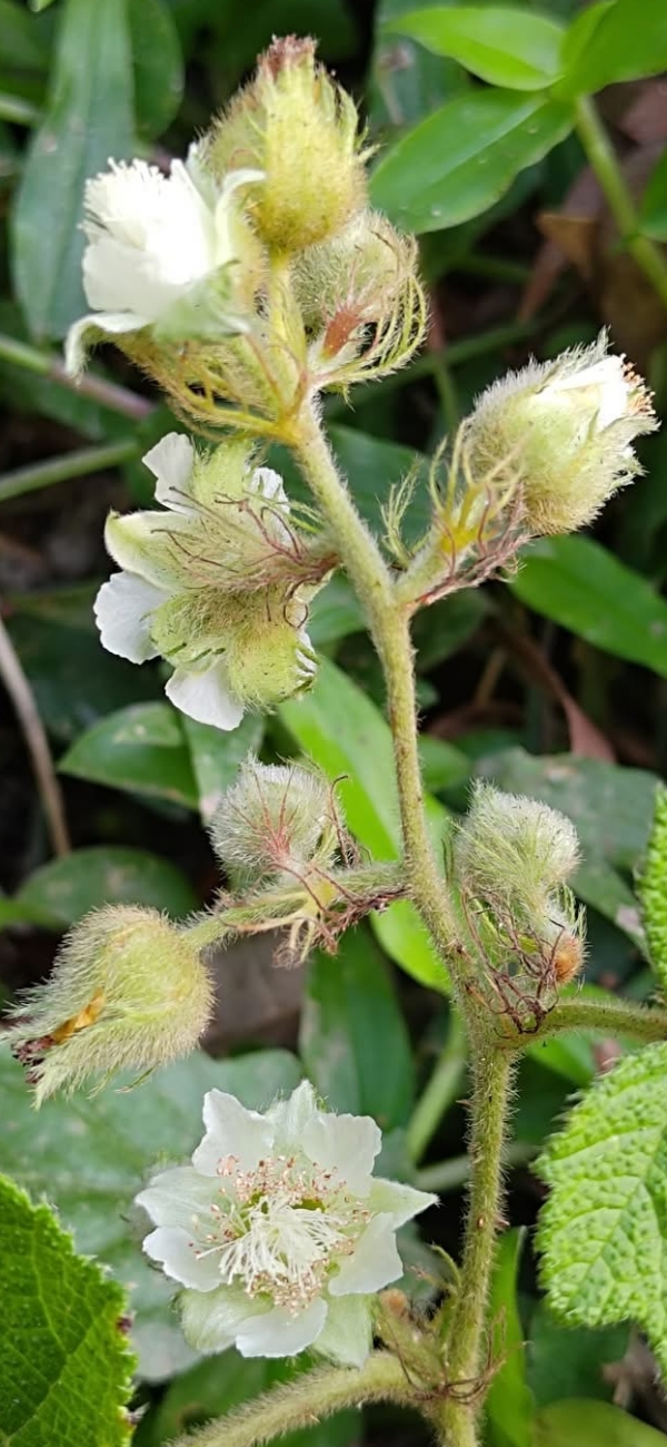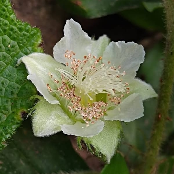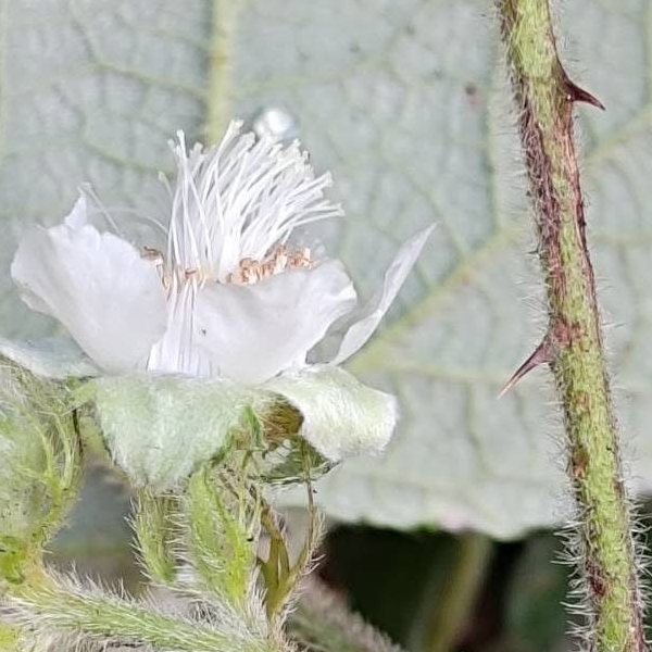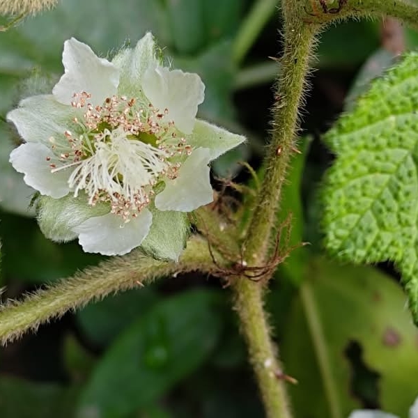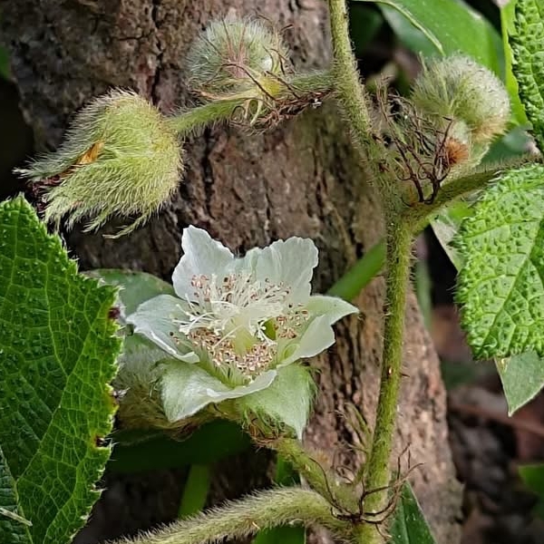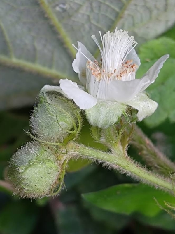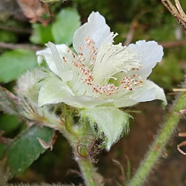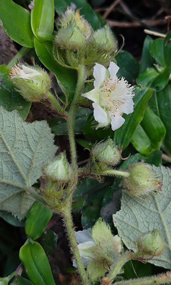 (原生種;台灣物種名錄標名羽萼懸鉤子,別名粗葉懸鉤子、新店懸鉤子、革葉懸鉤子,附有照片;匍匐性灌木;全株密被絨毛,疏生勾刺,勾刺長約0.5公分;單葉互生,掌狀,5~7淺裂,鋸齒緣,葉背灰色,托葉羽裂狀;總狀花序,腋生或頂生;花瓣5枚,白色;花萼被毛;聚合果,球狀,成熟紅色)