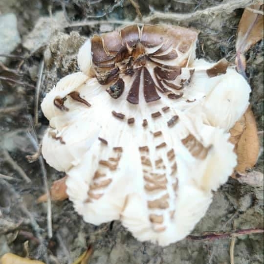 ============= 離褶傘科 疑似 雞肉絲菇 (Termitomyces eurhizus、真根蟻巢傘) ============= (原生種;大型菌菇,菌傘可達20cm;成熟易輻射狀裂開,露出白色菌肉;菌褶白色,密集,老熟乳白至黃色;菌柄約10~15公分,白色,基部常膨大;有假根連到地底白蟻巢的菌床上,長度可達30公分以上;雞肉絲菇和白蟻具共生關係,白蟻提供菌菇營養,白蟻則以菌絲為食)
