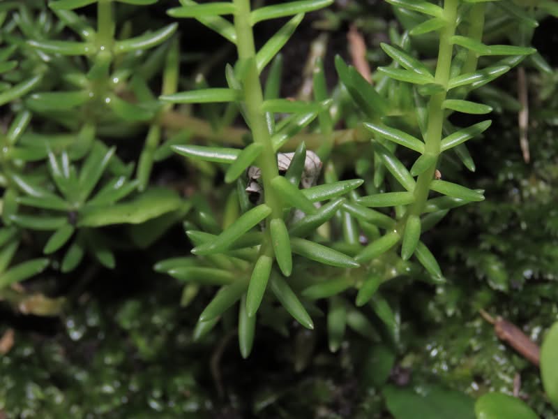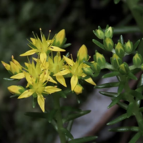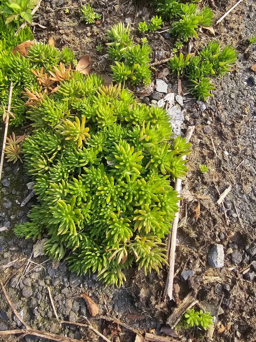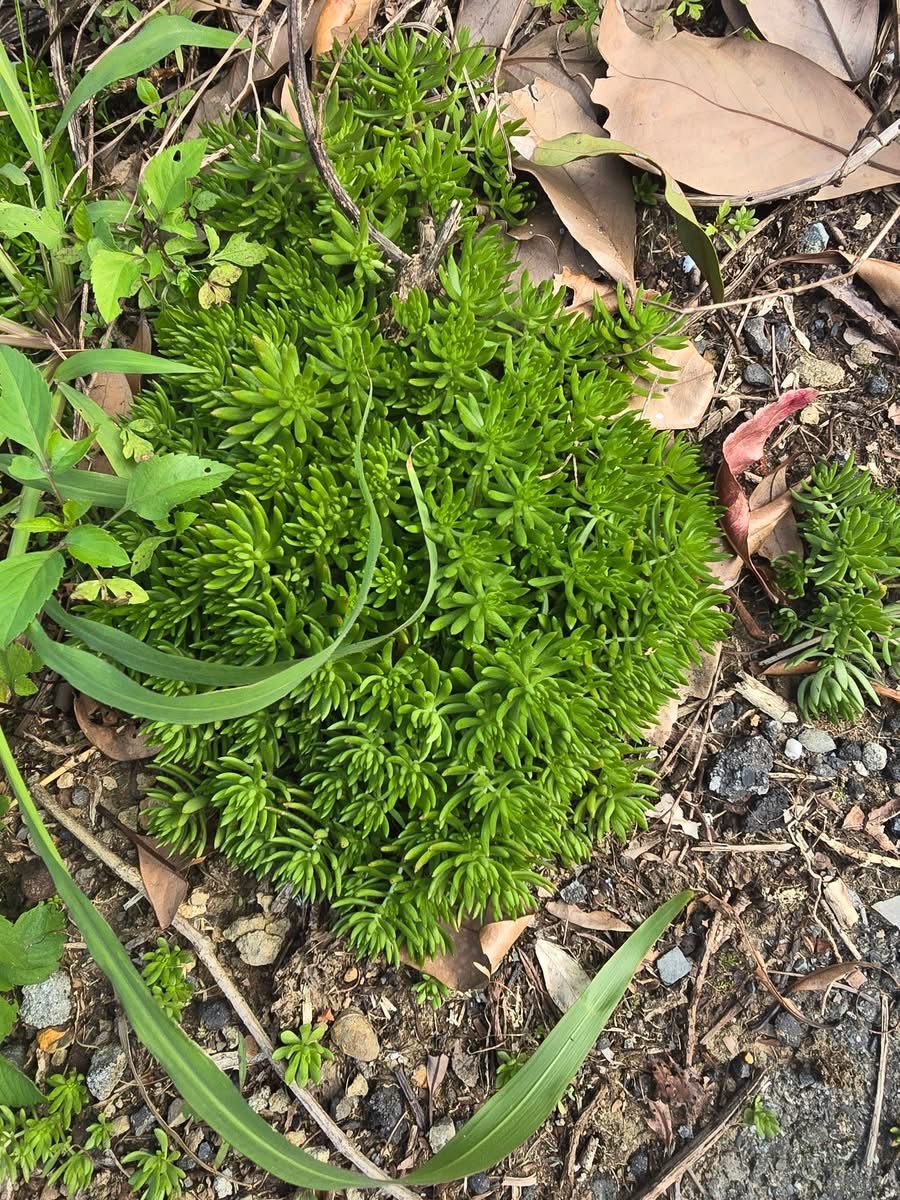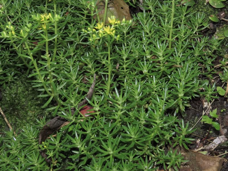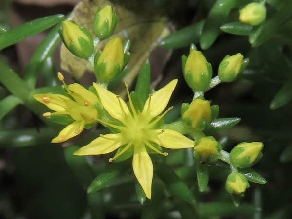 (歸化種;原產於墨西哥南部;台灣物種名錄標名松葉佛甲草,別名松葉景天、墨西哥佛甲草、墨西哥景天,附有照片;多年生草本;單葉,線柱形,肉質;葉序兩型,可孕枝單葉互生,不孕枝4葉輪生;穗狀花序呈圓錐狀排列,頂生;花瓣5枚,黃色;雄蕊10枚)