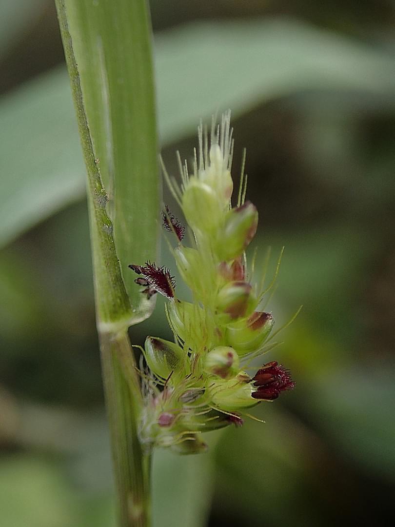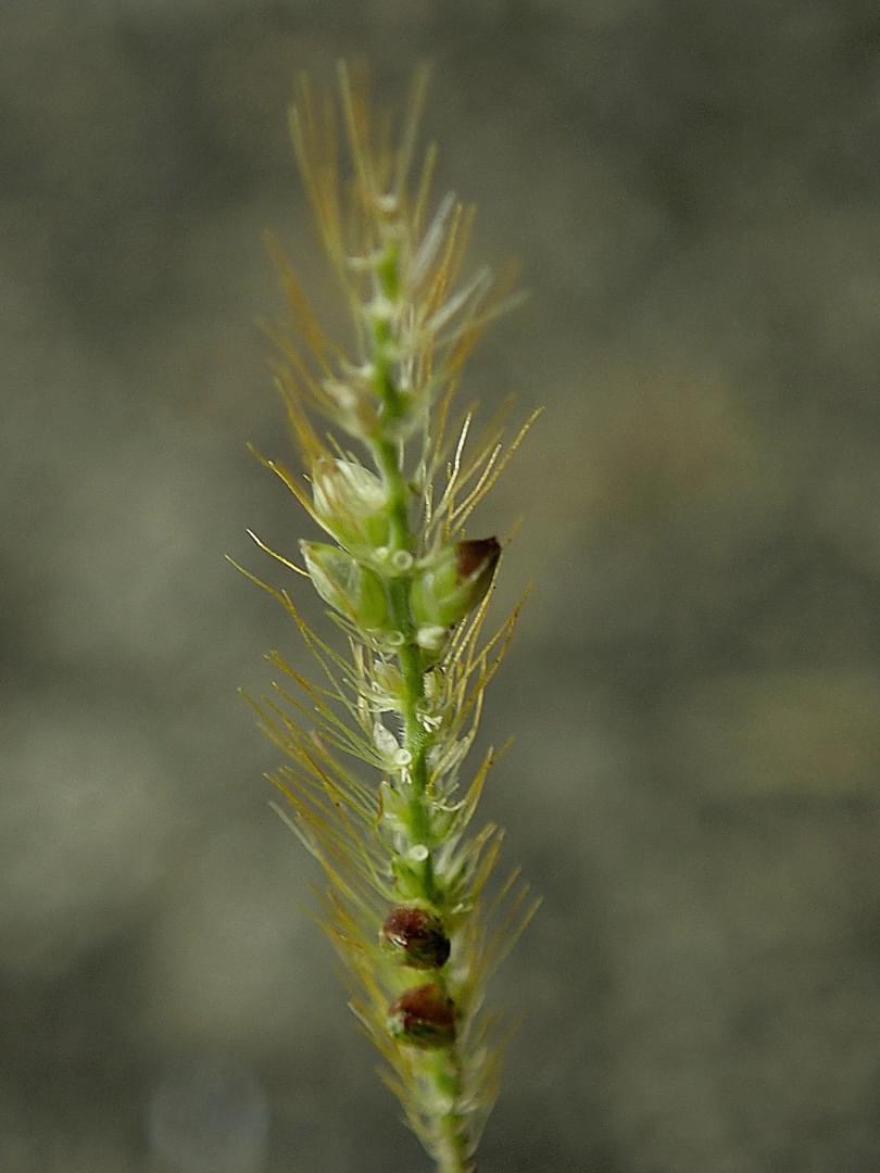 (原生種;普遍原生於亞洲、歐洲及非洲;台灣物種名錄附有照片;維基百科標名,別名,附有照片;形似水稻的雜草;一年生草本;稈直立或基部傾斜,光滑;葉鞘無毛;單葉互生,線狀披針形,上面粗糙;圓錐花序直立開展;小穗密集於穗軸一側,有硬刺毛;穎果,卵形,平滑光亮,先端具小尖頭)