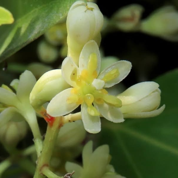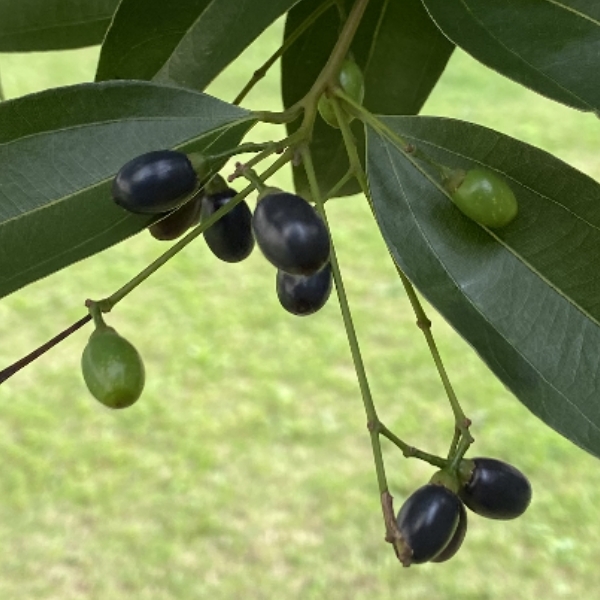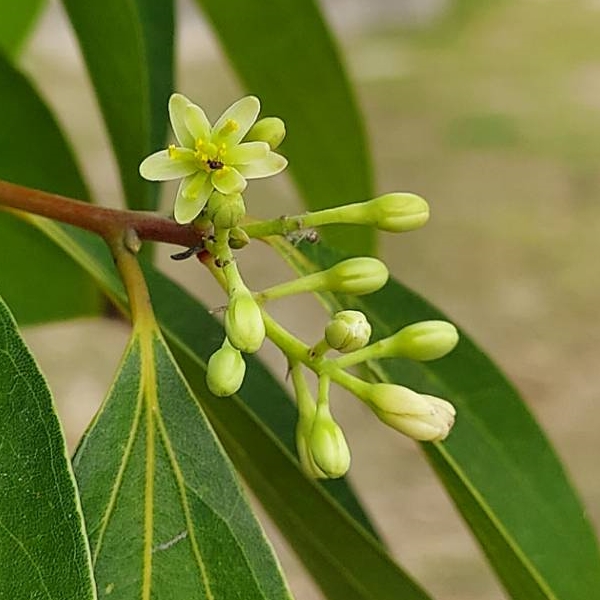 (歸化種;世界植物在線標示原生於台灣、菲律賓、印尼至中國大陸一帶(以分布地來看,台灣有可能也是原生地);台灣物種名錄標示為歸化種;喬木;單葉互生(或對生),卵形、長卵形、橢圓形至長卵狀披針形,全緣,離基三出脈;葉背粉綠色;樹頭或樹幹常見鮮紅色新芽和新葉;總狀花序(最末分枝為3花的聚繖花序),或排成更大的圓錐花序,腋生或頂生;花被片6枚,淡黃色至白綠色;核果橢圓形,成熟紫黑色;宿存萼片截斷狀)