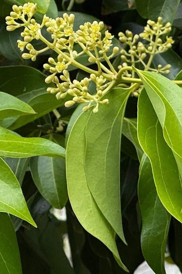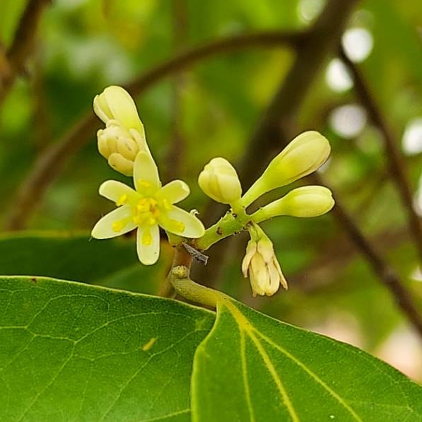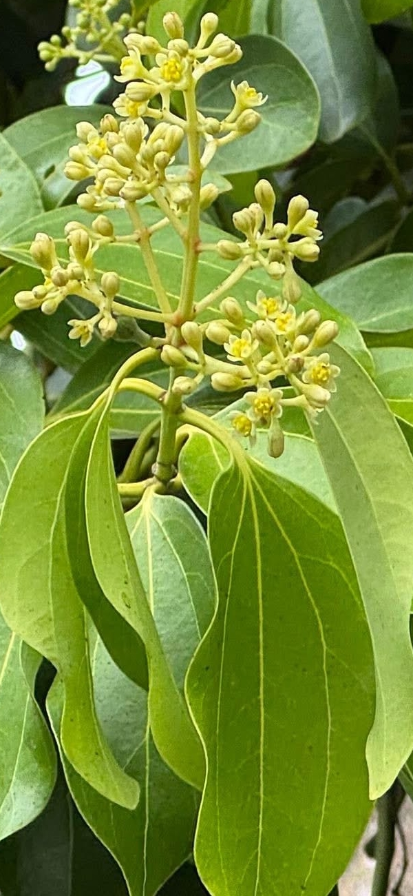 ![]() 上面照片:張儷蓁拍攝 (單葉互生(或對生),卵形、長卵形、橢圓形至長卵狀披針形,全緣,離基三出脈;葉背粉綠色;總狀花序(最末分枝為3花的聚繖花序),或排成更大的圓錐花序,腋生或頂生;花被片6枚,淡黃色至白綠色) |