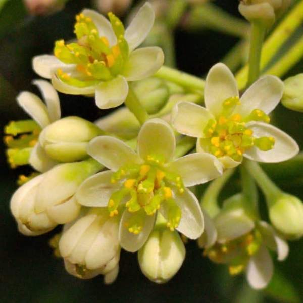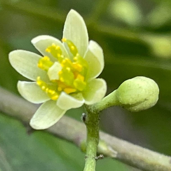 ![]() 上面照片:陳維琪拍攝 (單葉互生,離基三出脈;總狀花序(最末分枝為3花的聚繖花序),或排成更大的圓錐花序,腋生或頂生;花被片6枚,淡黃色至白綠色) |