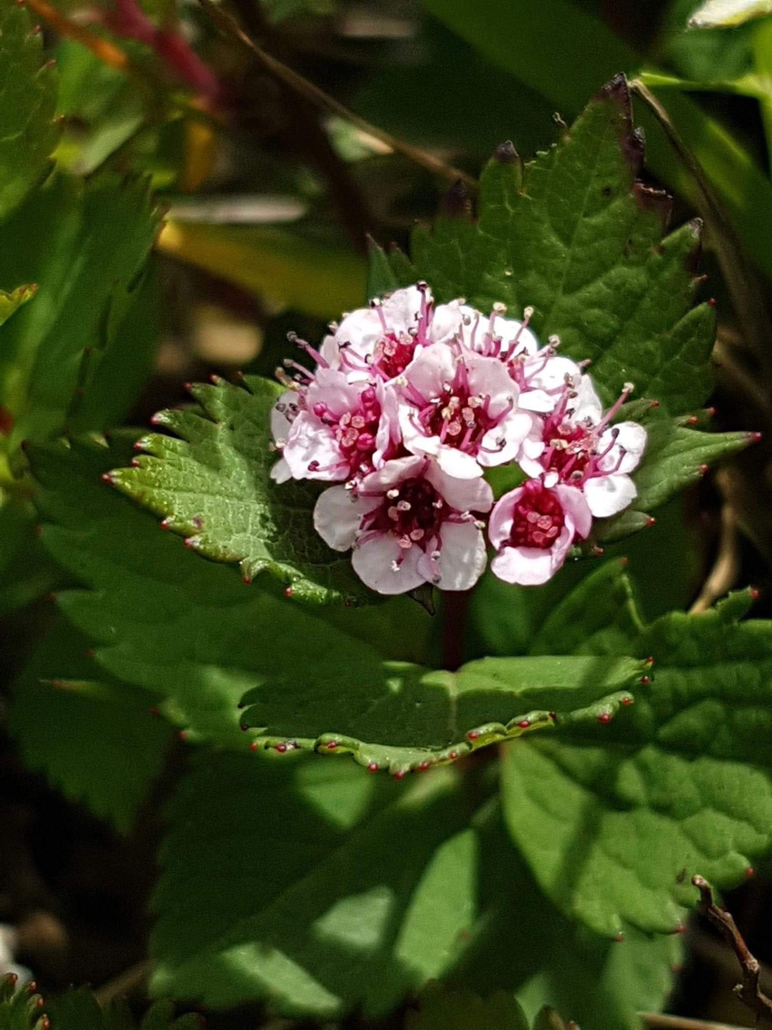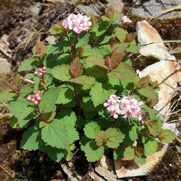 (台灣特有種;世界植物在線附有照片(相符);維基百科標名新高山繡線菊;落葉性灌木;植株低矮;全株光滑無毛(或幼時具短柔毛);單葉互生,闊卵形,鋸齒緣;花苞紅色;繖房花序,頂生,每個花序通常有花約10多朵;花瓣5枚,白色;雄蕊多數,花絲粉紅色,略長於花瓣,花心深桃紅色)