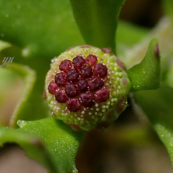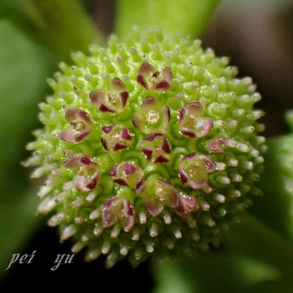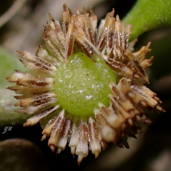 ![]() 上面照片:周佩玉拍攝 (雌花位於頭狀花序的外圍,數量較多;兩生花位於頭狀花序的中央,數量較少,花冠管狀,花瓣4枚) |